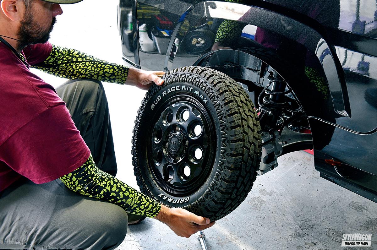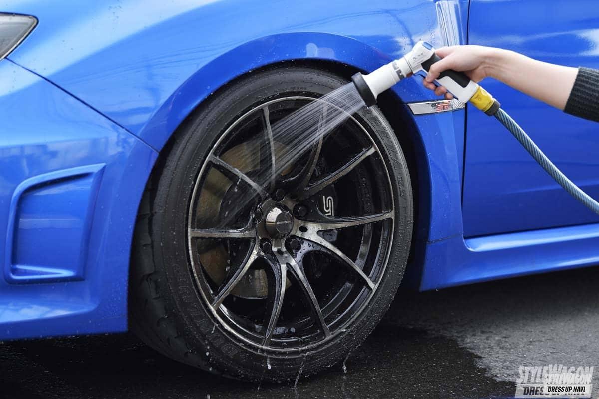 ボディを洗っていく前にホイールから洗うのが洗車の基本。バンパー下やサイドステップ下などの下回りもこの段階で洗うべし。