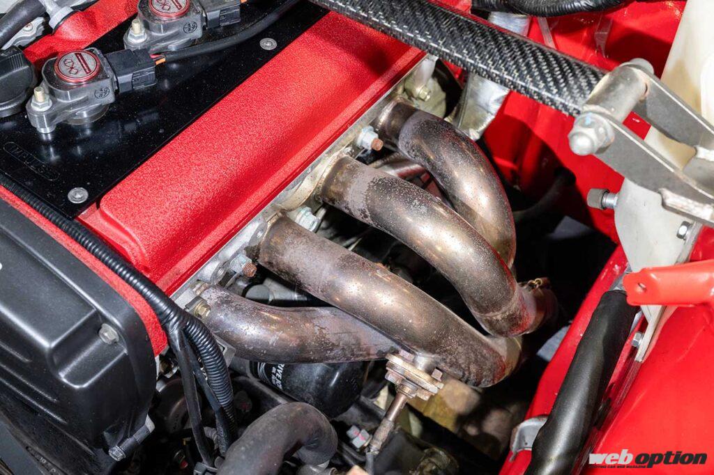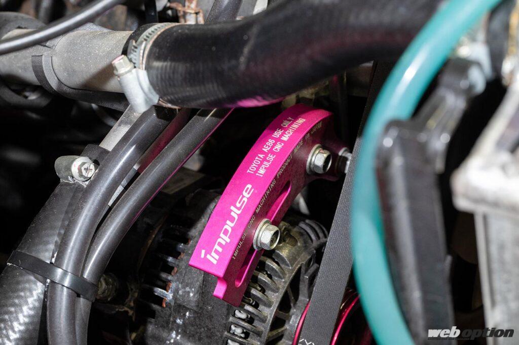 エンジンは排気量を1800ccに拡大したフルチューンの4A-G改5A-G仕様で、最高出力は220psを獲得。オルタネーターやラジエターのアルミ削り出しステー類も、近年インパルスで力を入れて開発を進めているパーツとなっている。