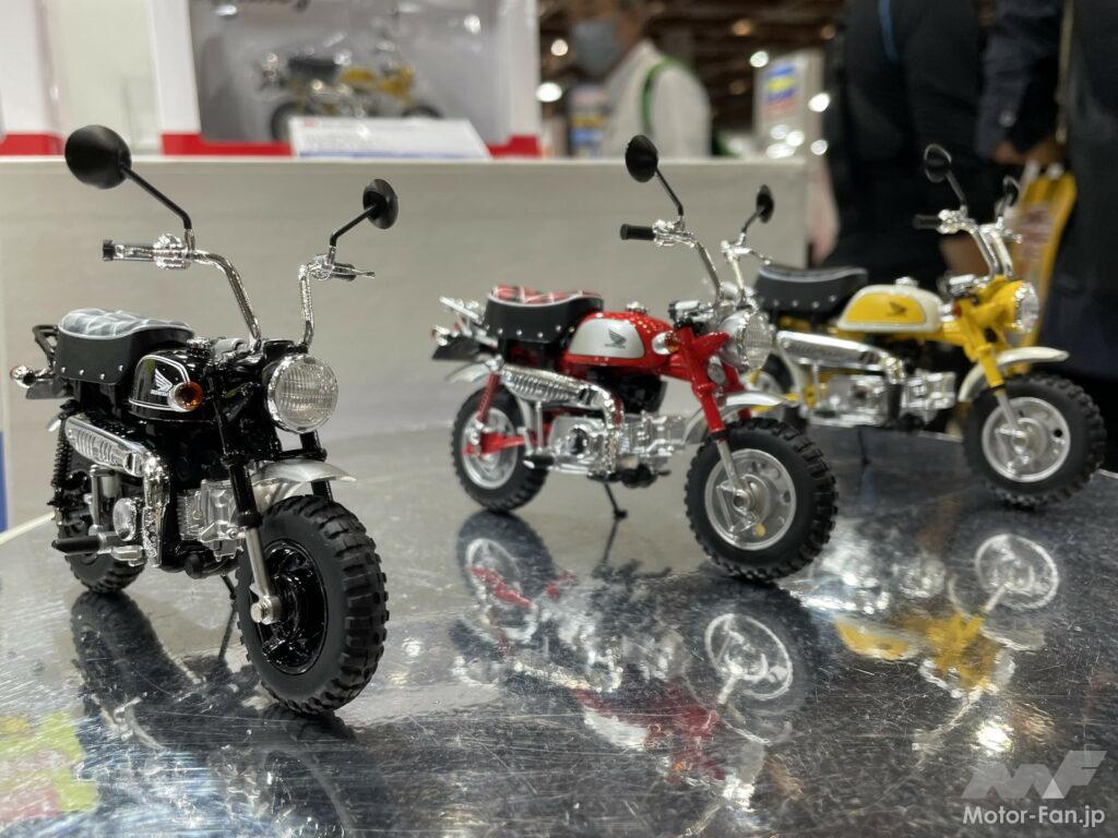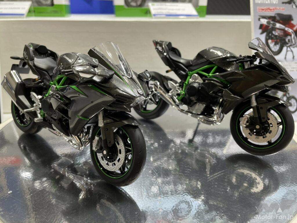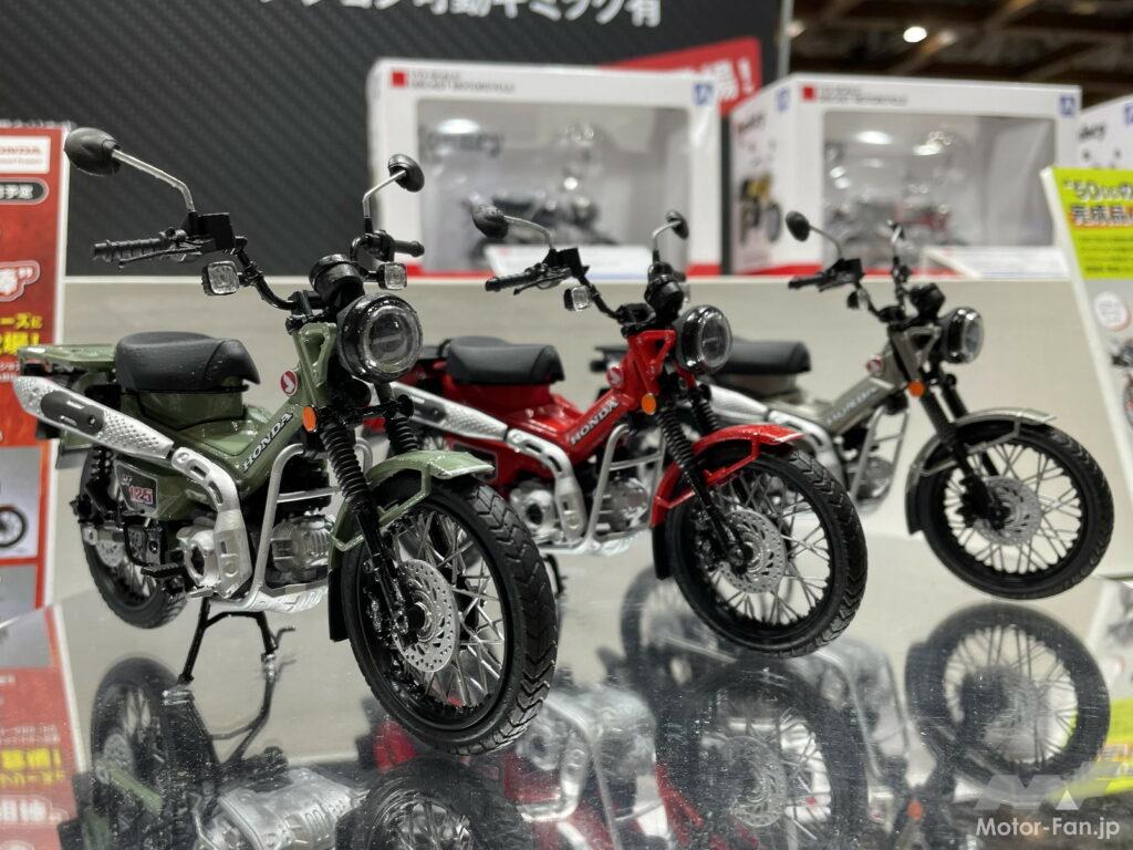 コレクション性の高い1/12スケール、フレームやタンクにはダイキャスト製パーツを採用して実車に近い質感や重量感を再現するバイク模型の完成品シリーズ、1/12完成品バイクのシリーズも充実。高い人気を誇るHonda CT125 ハンターカブ(3色あり/各2024年1月発売予定、予価3850円(税込))を中心に、Kawasaki Ninja H2 CARBON ‘19と同H2R ‘19(いずれも2023年10月発売予定/予価4070円(税込))、Honda モンキー(3色あり/各2023年11月発売予定、予価3520円(税込))を展示。手ごろな価格でコレクションも捗るだろう。