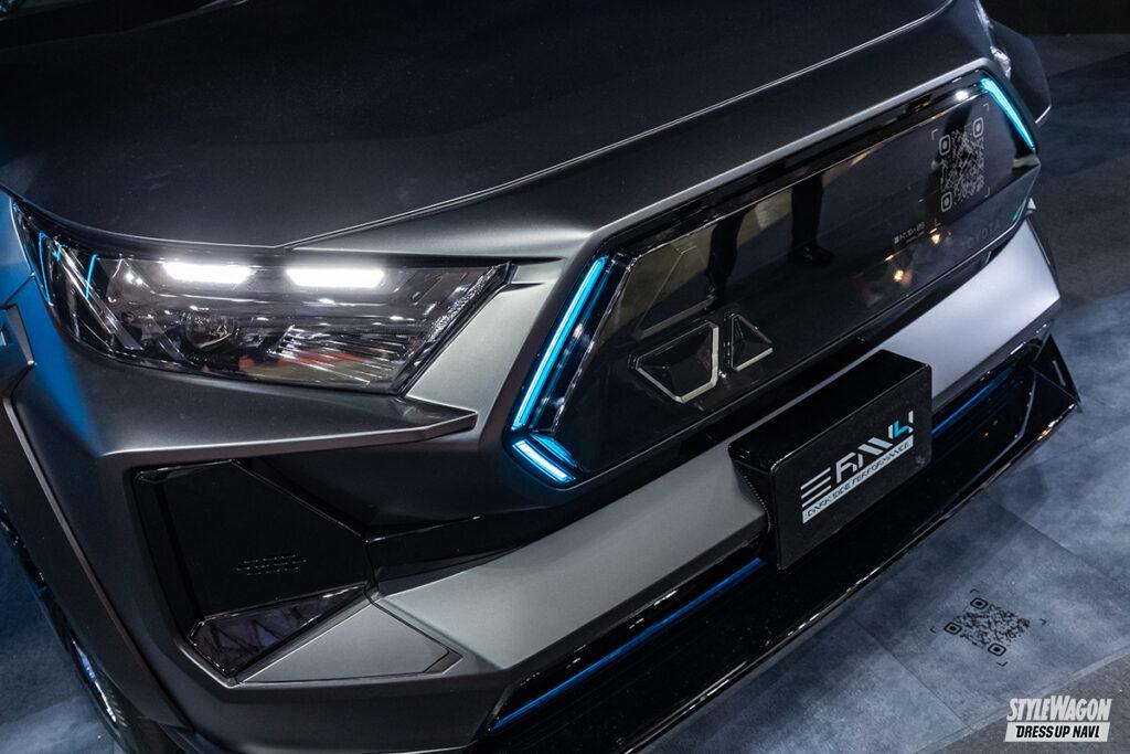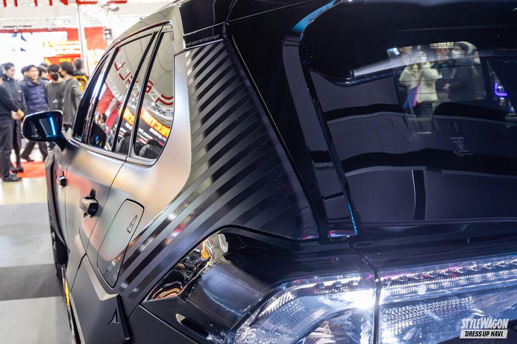 薄暗いブースに浮かび上がるシルエット。ブラックアウトされたボディにブルーグリーンの光彩。豊田自動織機が提案するひとつめのコンセプトは「ダークSFの世界観」だ。標準仕様ではSUVらしさ漂うRAV4だが、コンセプトカーはそのイメージを大胆に払拭。マッシブでダークな1台を作りあげた。グリル部分にはカバーをあしらい、リップも若干張り出し気味に造形。さらにオーバーフェンダーを組み合わせてRAV4のフォルムを一新。より、タフで鋭さ漂うスタイリングに仕上げている。また、マットなボディの随所にツヤありブラックのステッカーチューンを施し、質感の違いで見せるさりげないポイントを作るなど工夫が凝らされているのも見所だ。そして、何よりも雰囲気を高めているのが、グリル両端やリップに施されたLEDメイク。ブラックのボディを引き立たせるようにあしらった幻想的なライトメイクがSF感を十二分に際立たせている。まるで映画の世界から飛び出してきたような一台。そう思わせる魅力に満ちたコンセプトカーと言えるだろう。
