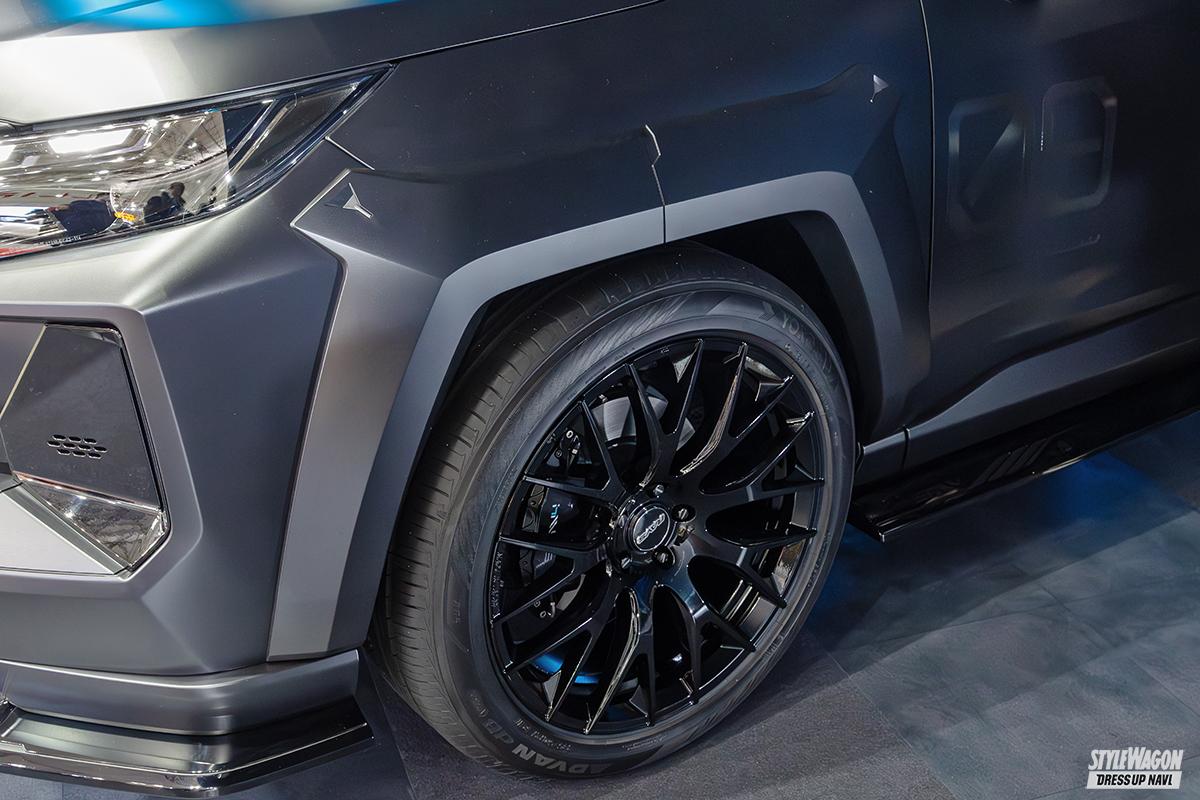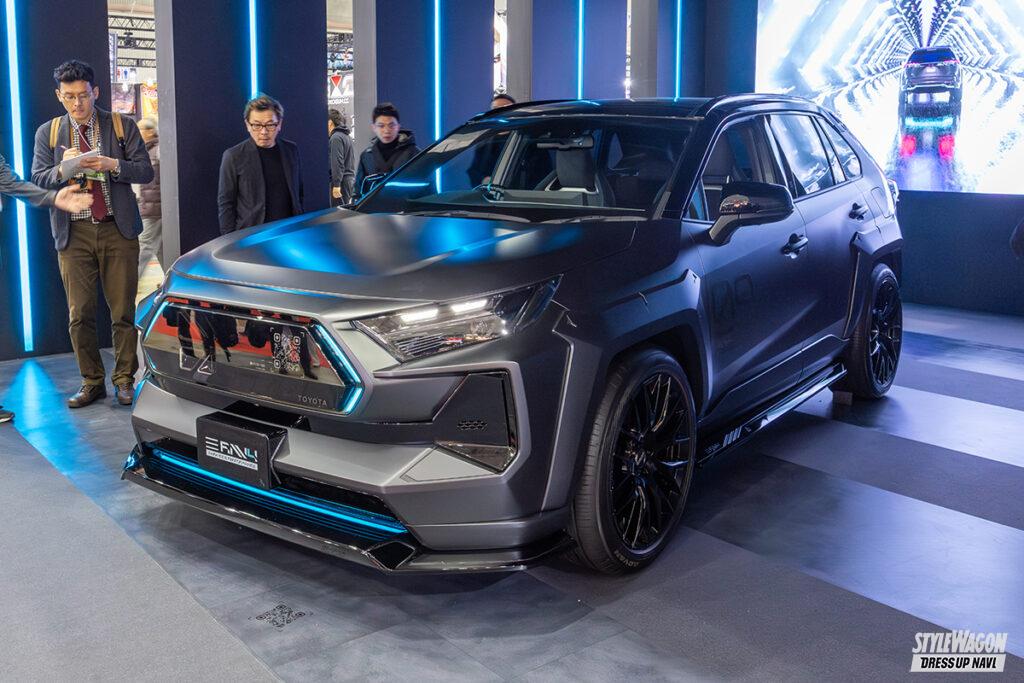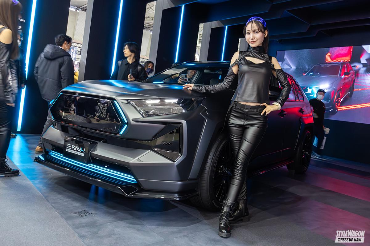 薄暗いブースに浮かび上がるシルエット。ブラックアウトされたボディにブルーグリーンの光彩。豊田自動織機が提案するひとつめのコンセプトは「ダークSFの世界観」だ。標準仕様ではSUVらしさ漂うRAV4だが、コンセプトカーはそのイメージを大胆に払拭。マッシブでダークな1台を作りあげた。グリル部分にはカバーをあしらい、リップも若干張り出し気味に造形。さらにオーバーフェンダーを組み合わせてRAV4のフォルムを一新。より、タフで鋭さ漂うスタイリングに仕上げている。また、マットなボディの随所にツヤありブラックのステッカーチューンを施し、質感の違いで見せるさりげないポイントを作るなど工夫が凝らされているのも見所だ。そして、何よりも雰囲気を高めているのが、グリル両端やリップに施されたLEDメイク。ブラックのボディを引き立たせるようにあしらった幻想的なライトメイクがSF感を十二分に際立たせている。まるで映画の世界から飛び出してきたような一台。そう思わせる魅力に満ちたコンセプトカーと言えるだろう。