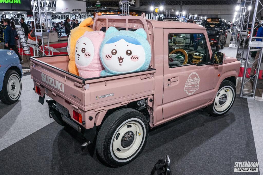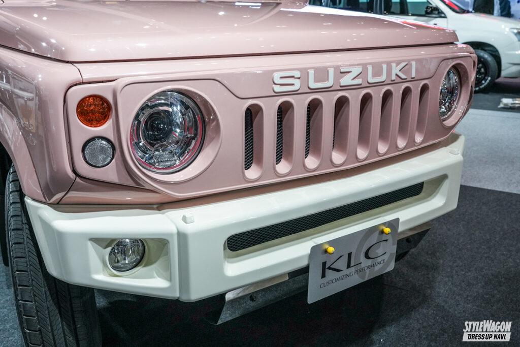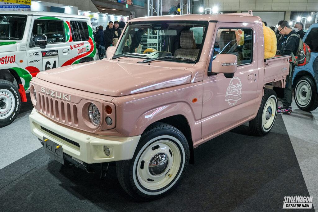 デビューからはや8年が経過するも、JB64ジムニーのドレスアップ人気は衰え知らず。数々の新作デモカーのなかで、カワユスな個性がひときわバエまくっていたのが、KLCの「ヘリテージ・ジムニートラック」だ。合計10種類をラインナップするKLCオリジナルのフェイスグリルのなかから初代SJ10風デザイン“エスジェイ”を装着。“オシャレピンク”と名付けたピンクのボディカラーも女子ウケよさげだが、なによりのアイキャッチはボディの後ろをカットして荷台化したカスタムメイドのピックアップトラック仕様だ。市販予定はなくショーモデルとしての改造だが、往年の2代目ジムニー1000に実在したピックアップの再来をいく均整の取れたフォルムと自然体なディテールに思わず惚れ惚れ。