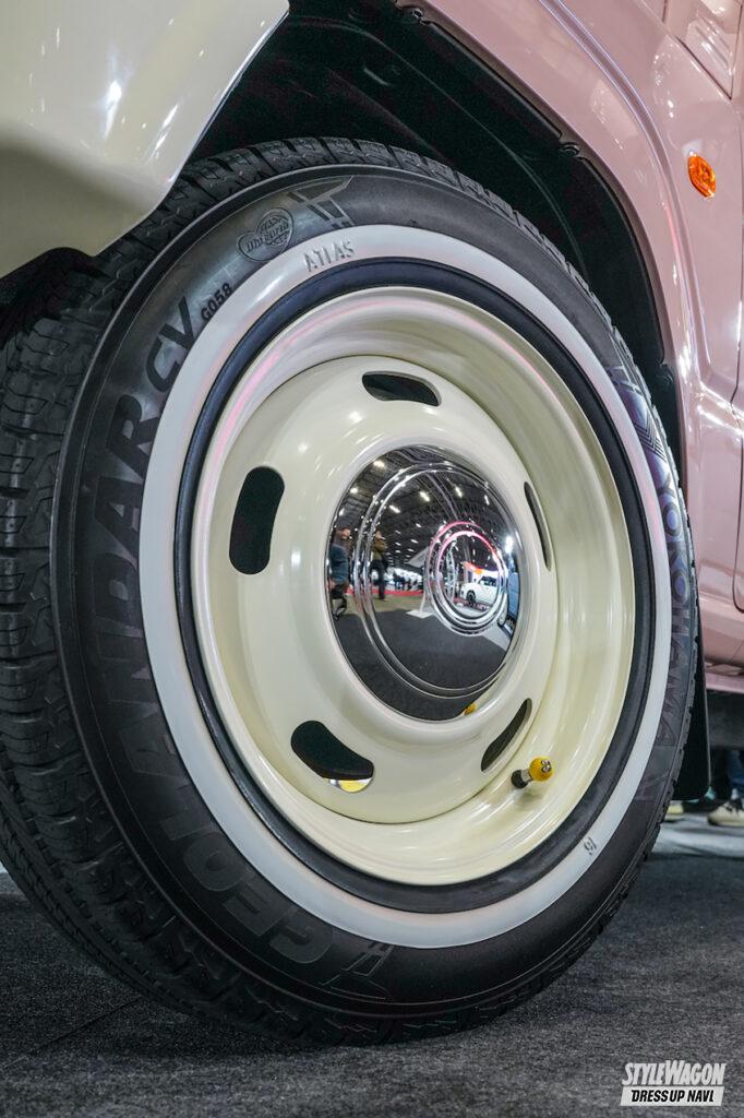 “オールドカントリー・バニラ”。サイズは16インチでJB64用の5.5Jモデルを装着する。タイヤはオンロードユースの“ヨコハマ・ジオランダーCV058”の175/80R16で、アトラス社のホワイトリボンを組み合わせることでクラシカルなムードを演出している。