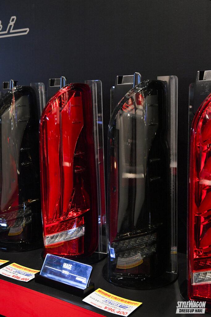 ハイエース用ヘッドライトは、昨年のオートサロン会場でお披露目されたものの、正式商品版がお披露目。コの字型ライトバーの内側に3連プロジェクターを搭載した先進モデルで、ウインカーと連動したコーナリングランプ機能を搭載。年式により装備されるスマートエントリー車であれば、ステアリングの舵角に連動させることが可能と、機能性の高さも見過ごせない。