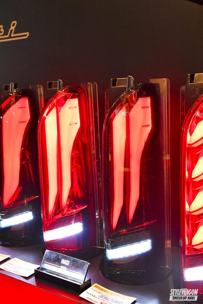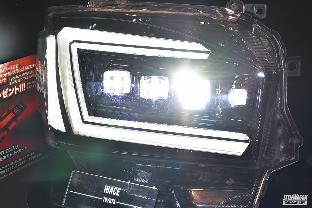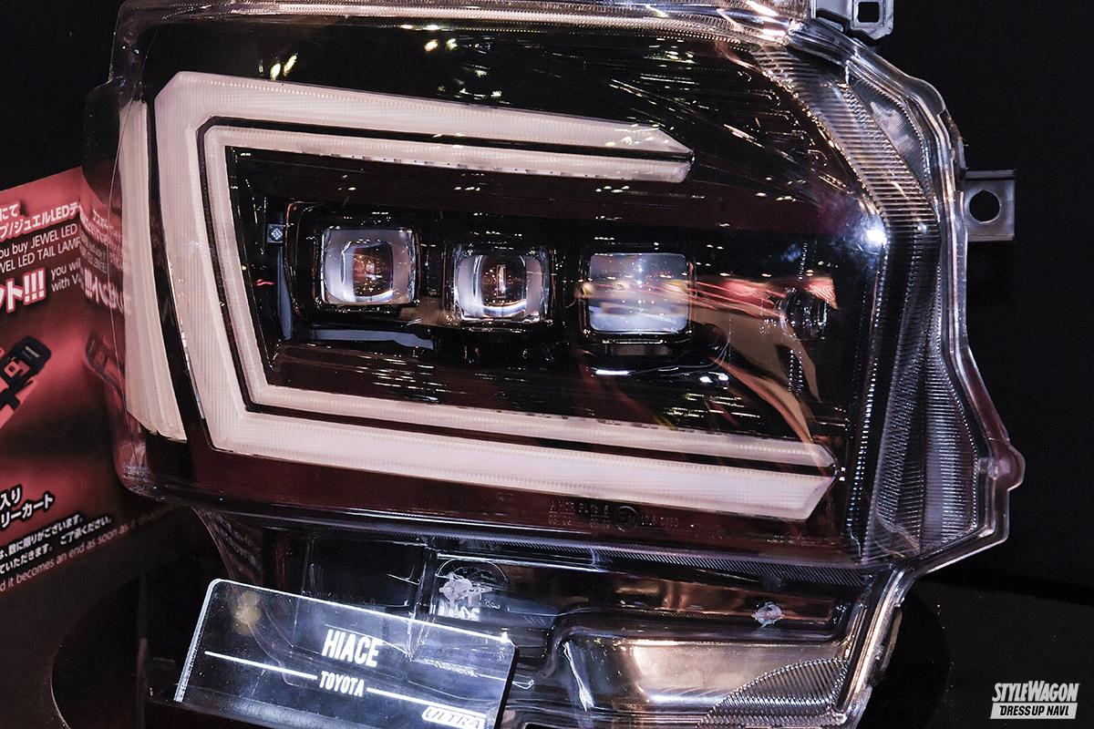 ハイエース用ヘッドライトは、昨年のオートサロン会場でお披露目されたものの、正式商品版がお披露目。コの字型ライトバーの内側に3連プロジェクターを搭載した先進モデルで、ウインカーと連動したコーナリングランプ機能を搭載。年式により装備されるスマートエントリー車であれば、ステアリングの舵角に連動させることが可能と、機能性の高さも見過ごせない。