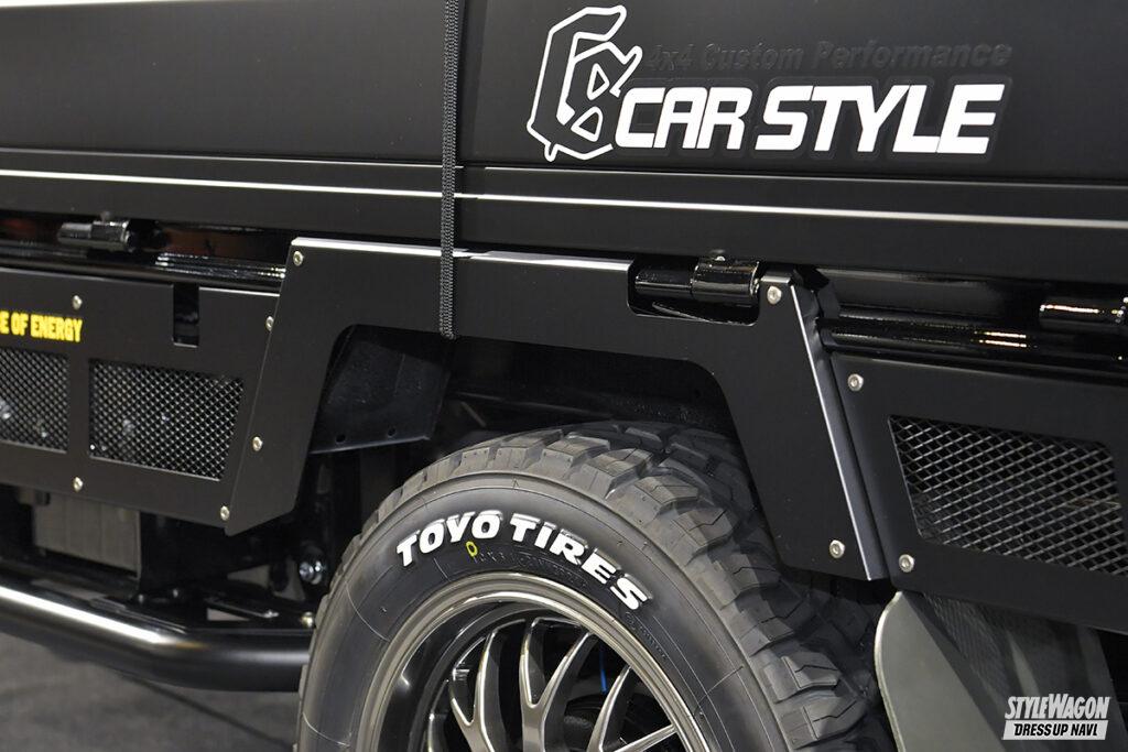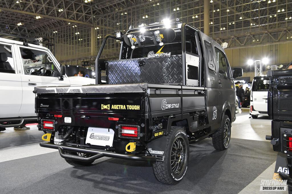 仕事に趣味にとアクティブに使える、イバリ度満点なリフトアップカスタムを含めた、四駆カスタム全般を得意とするカースタイル。Kトラックをベースとした、昨今人気を博す“アゲトラ”ブームに火をつけたブランドとしても知られているが、以前から温め続けていたアゲトラの進化バージョンといえる、スーパーキャリィベースのギアタフが初お披露目され注目を集めた。