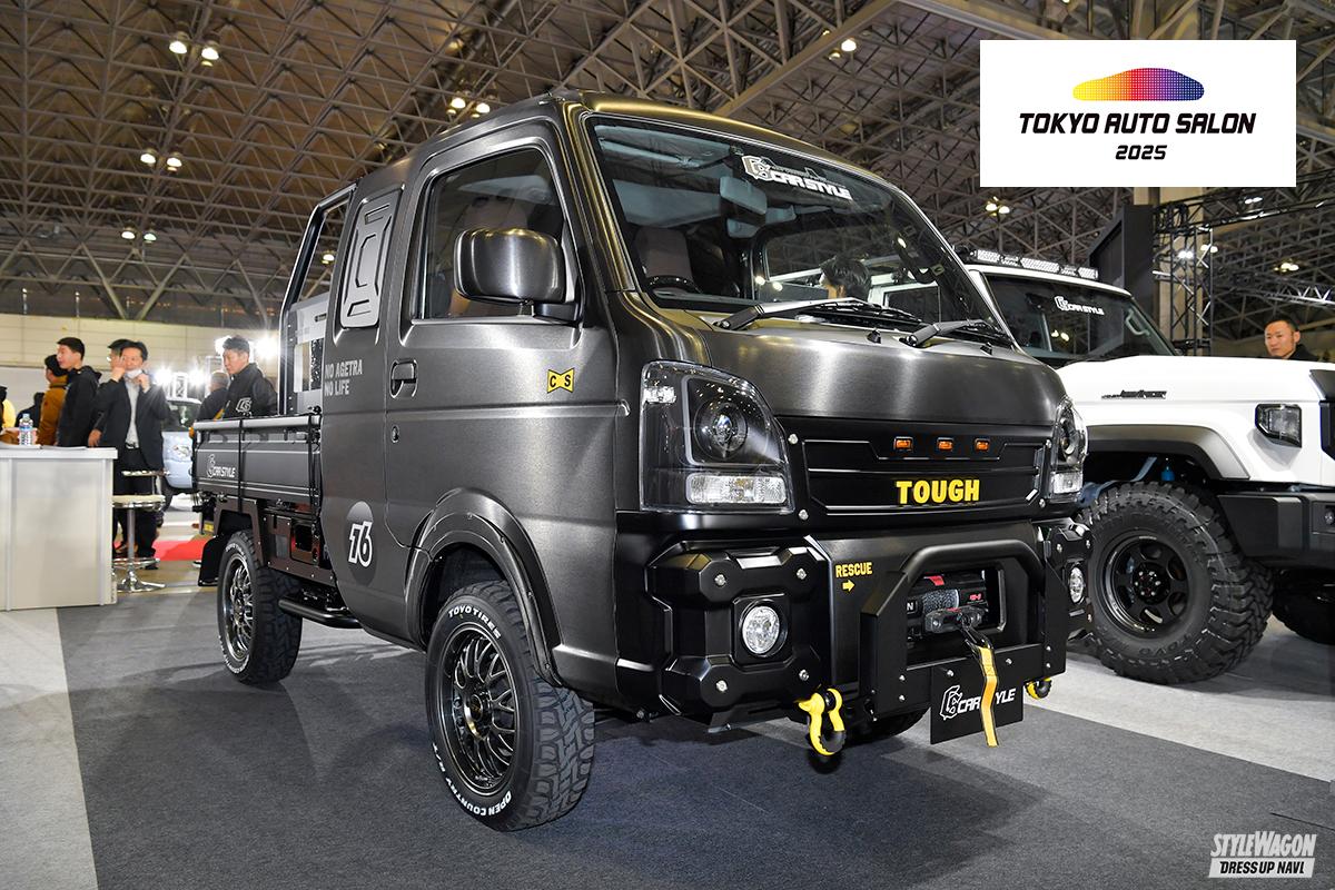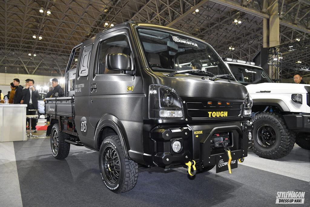 仕事に趣味にとアクティブに使える、イバリ度満点なリフトアップカスタムを含めた、四駆カスタム全般を得意とするカースタイル。Kトラックをベースとした、昨今人気を博す“アゲトラ”ブームに火をつけたブランドとしても知られているが、以前から温め続けていたアゲトラの進化バージョンといえる、スーパーキャリィベースのギアタフが初お披露目され注目を集めた。