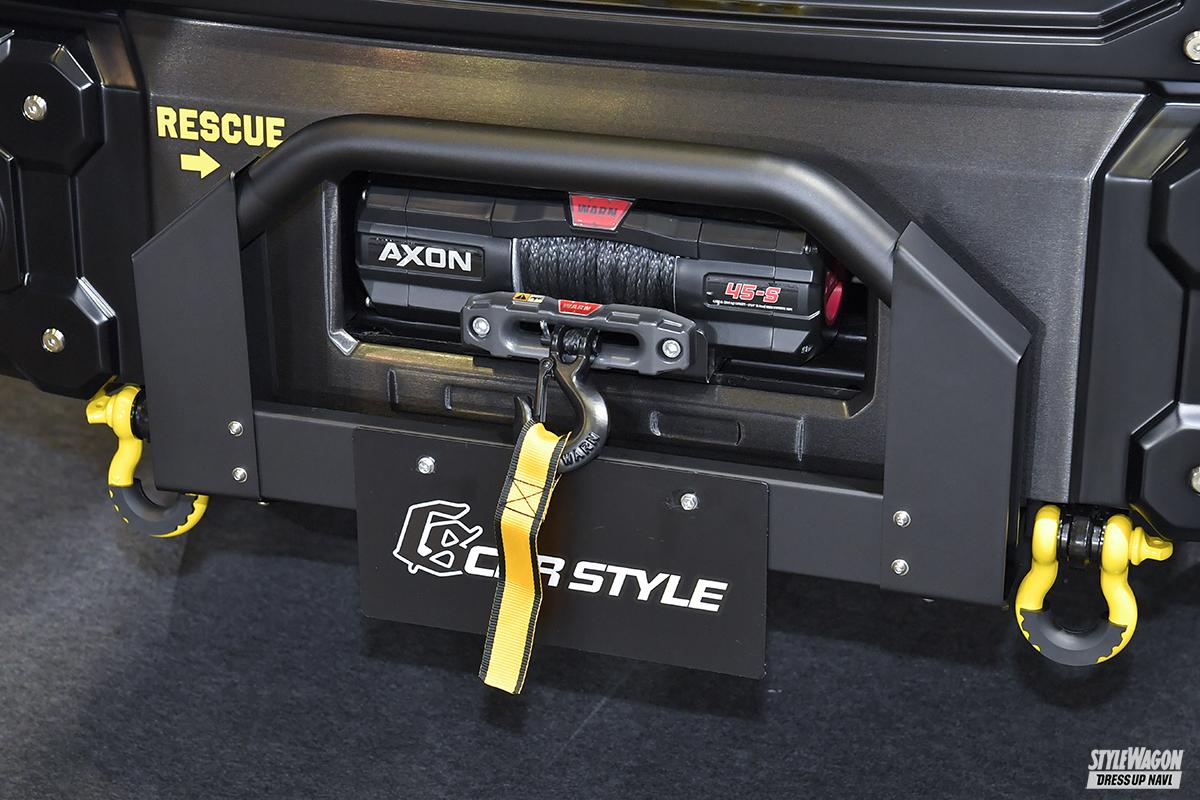 まず目に付く貫録のフロントマスクは、フロントバンパー、バンパーガード、ウインチ、アンダーガードで構成。バンパーはGショック風ともいえるゴツさを表現し、大人のオモチャ感を演出。ウインチを取り囲む極太のガードは、スチールを使って開発と素材にもこだわっている。