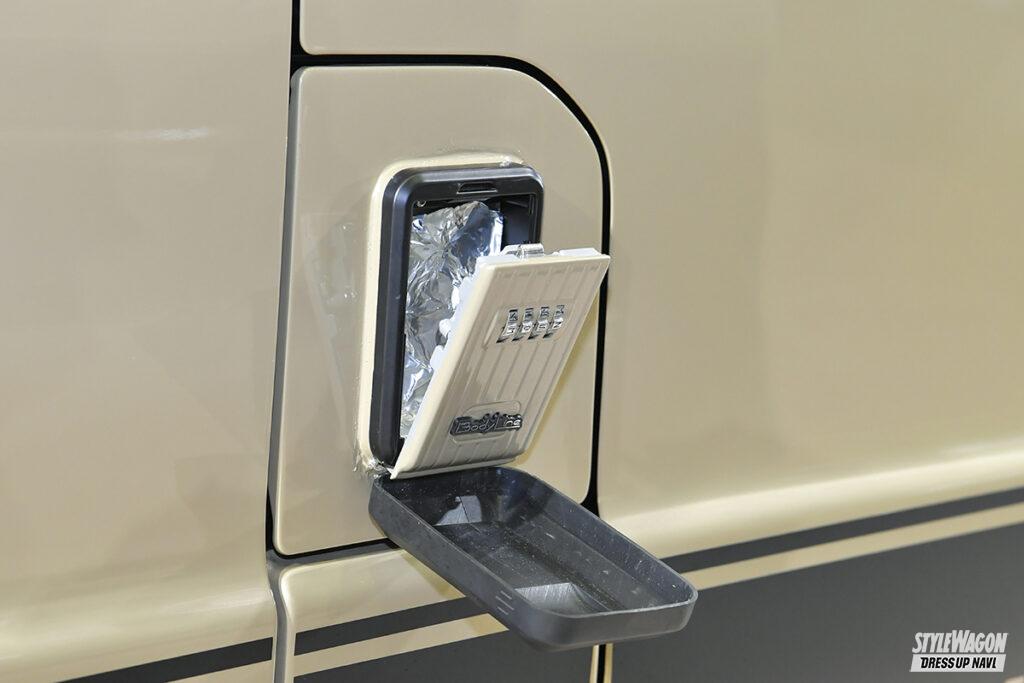 そのほかにも、オリジナルステアリングやそれ対応のクルーズコントロールキットを販売するほか、日よけのサイドオーニングもオリジナルで提案とパーツは多数あるのだが、気になって仕方がないのが、ボディ側面にある黒い四角い突出。じつはこれワンオフのキーボックス。