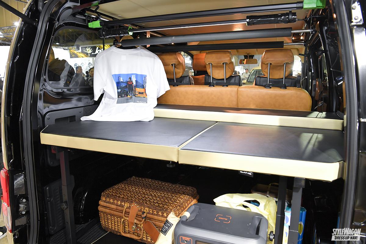 真っ先に手に入れて欲しいのは、休憩はもちろん、収納力向上の観点からも注目して欲しいベッドキットだ。2タイプあるうち、デモカーはType2と呼ぶ6:4の2分割の跳ね上げ式を実装しており、デッドスペースとなり得る頭上にはルーフキャリアやサイドバーを用意と、実用パーツが複数揃う。