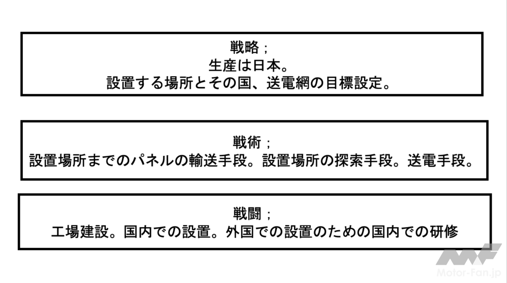 このうち、生産は日本で開発される生産技術に基づいた工場で行なわれるが、技術流出を防ぐためには日本で生産も行なう。生産するパネルをどの地域にどの位の速度で設置するかの目標作りと、国内の林業、農業、漁業及び上空のどこに設置して行くか、発電した電力を集める送電網の設置目標を定めることが戦略の要になる。