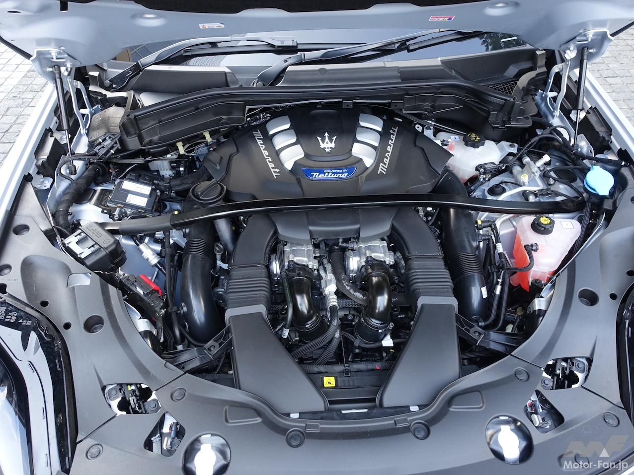 90度のV型6気筒3.0Lで630ps/730Nmという大出力。F1由来のプレチャンバー燃焼システムを持つエンジンだ。グレカーレには、このエンジンをデチューンし、530ps/620Nmの出力で、気筒休止システムも搭載している。