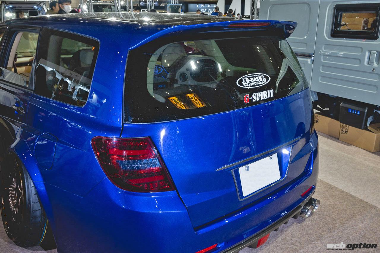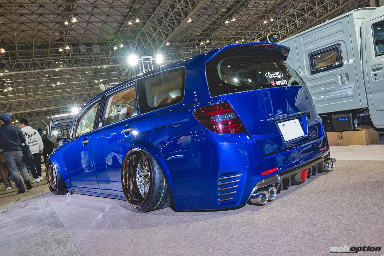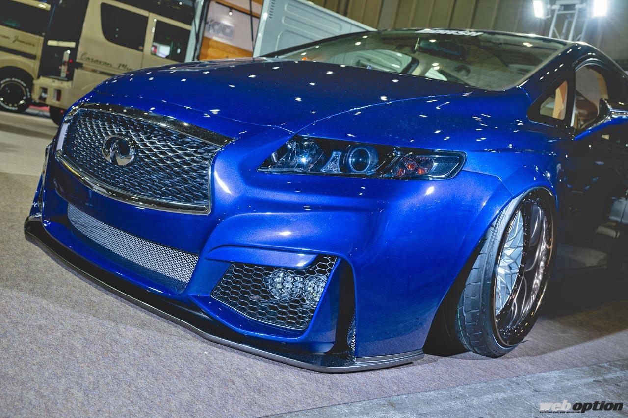 極低車高スタイルを支える足回りは、ロームエアーのエアサスペンションシステム。ホイールは19インチのワークVS XVで、フロントは10Jマイナス35、リヤは12Jマイナス30というサイズになっている。フェンダーはワンオフで製作されたブリスターフェンダーにさらにオーバーフェンダーを重ねたスタイルで、ボディカラーはレクサス用のヒートブルーコントラストレイヤリングが採用されている。