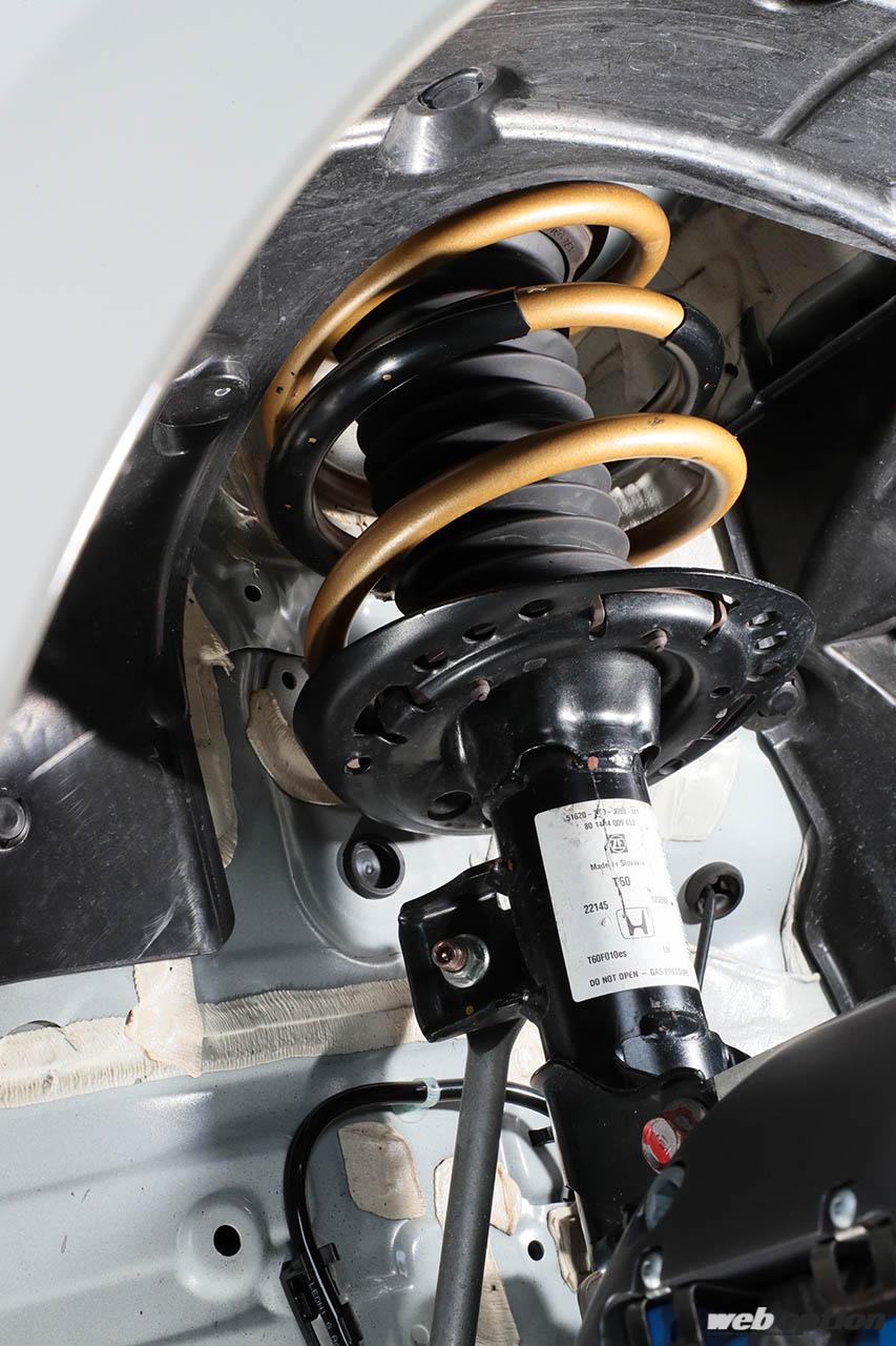 ダウン量はフロントがマイナス25mm、リヤがマイナス20mm。スプリングレートはフロントが3.5~5.0kg/mm(純正4.8)&リヤ2.5~4.5kg/mm(純正4.4)の可変レート仕様で、街乗り領域では純正よりもソフトに、荷重のかかりやすいスポーツ走行時には純正よりも踏ん張るセッティングとなる。