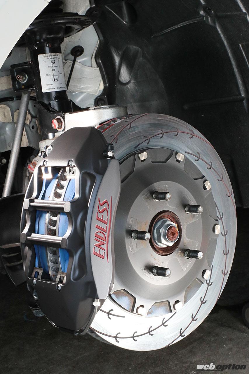 420ps仕様で連続周回を重ねると純正ブレーキキャリパーのピストンシールが厳しくなるため、フロントはエンドレスのレーシングMONO6へと変更。今後、サーキットでの限界性能だけでなくストリートでの使い勝手も確認していくそうだ。