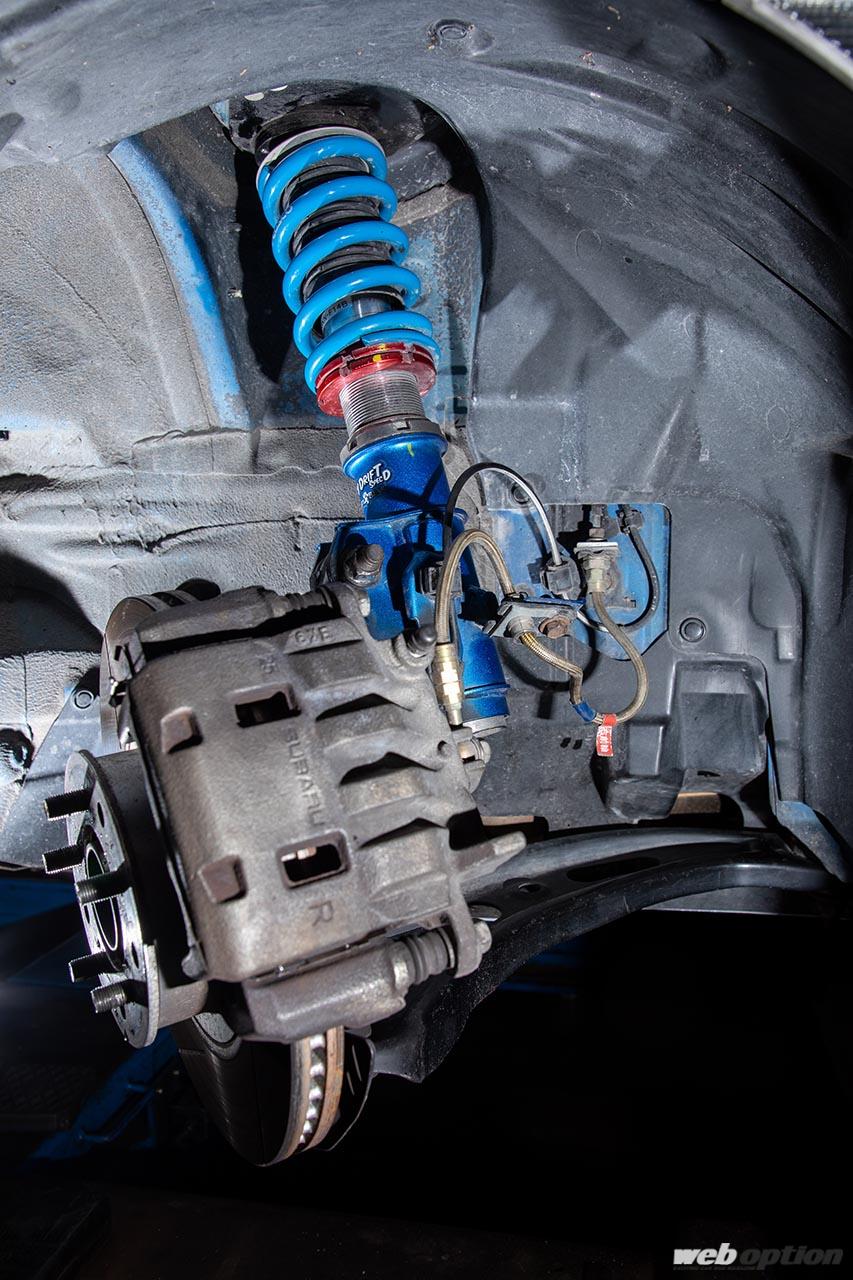 サスペンションはオリジナルセッティングが施された、オリジナルのスタンダードキットスペックDS (25万3000円)を軸に構築。『角度が付くとそれに耐えられず、イン側へ巻いていってスピンモードに陥りやすい』というノーマルのネガ要素を払拭するために、クスコのスポーツR車高調をベースにレート変更やヘルパースプリングの追加などを行なったスペシャル仕様だ。