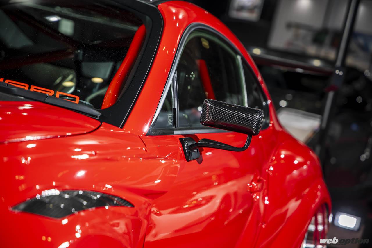 ドアミラーはアメリカのEVSチューニング製カーボンGTLMエアロミラーを装着。全身をレーシーなワイドボディで彩った最後にアクセントとして効いてくるアイテムだ。