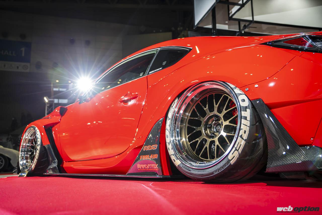 ワイドフェンダーはフロント85mm、リヤ70mmの拡幅を実現。サイドスカートにはビッグアンダーボードと呼ばれる整流板が設けられている。ホイールはレイズのボルクレーシング21A SRで、サイズは10.0J×18。タイヤはトーヨーのプロクセスR888R。サイズは前後ともに255/35R18を組み合わせる。