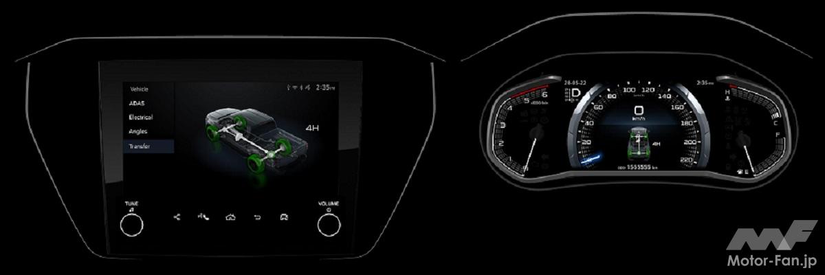 インパネガーニッシュとドアインサート、シート素材には、ミウラ折りパターンをモチーフにしたデザインが取り入れられ、新しさと高級感を演出。7インチに拡大したメーター内のTFTディスプレーとインフォテーメントディスプレーには、いすゞユニークのGUI(グラフィカル・ユーザー・インターフェイス)を採用することで、タッチスクリーンの使いやすさと視認性が向上し、洗練された上質感が実現された。