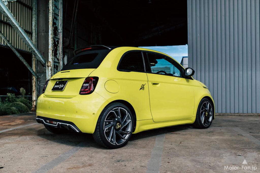 全長3675×全幅1685×全高1520mm、ホイールベース2320mmのコンパクトなサイズを維持しつつ、前輪を駆動する155ps/235Nmのパワフルでレスポンスの優れたモーターと、42kWhのバッテリーにより、低中速域においてもエキサイティングな走りを実現。0-100km/h加速タイムは7秒で、ガソリン車の「アバルト695」とほぼ同じタイムを記録する。20-40km/h、40-60km/h の中間加速ではアバルト695より約1秒速いタイムを記録し、シティ走行においてアバルト695を超えるパフォーマンスを発揮する。なお、WLTCモードにおける一充電走行距離はハッチバックが303km、カブリオレが294kmと発表された。