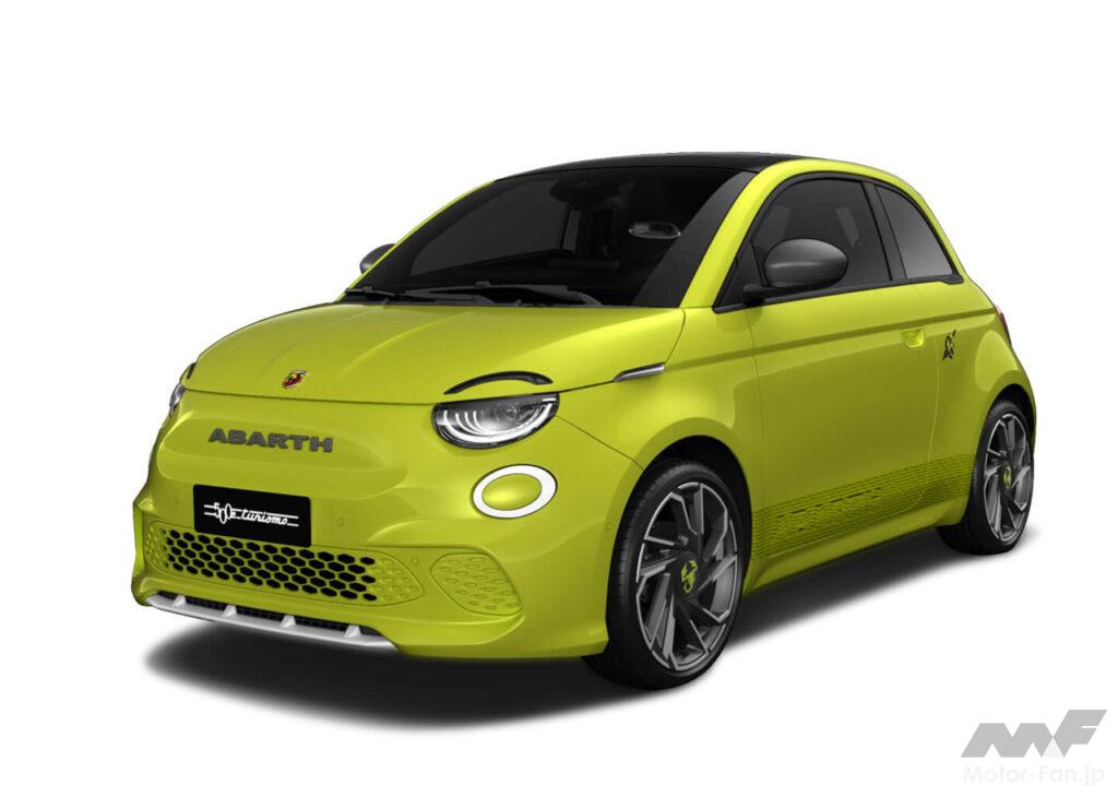 アバルト500eの日本導入を記念した、ローンチエディションの限定車「スコーピオニッシマ」は、ブランドの誕生年にちなんで、全世界1949台を発売。このうち200台が日本市場に割り当てられた。ボディタイプは、ハッチバックとカブリオレの2タイプを設定。専用のサイドデカール、デジタルサーティフィケーション、およびウェアラブルキーを特別装備。ボディカラーは、限定車専用色のポイズンブルーとアシッドグリーンの2色から選べる。