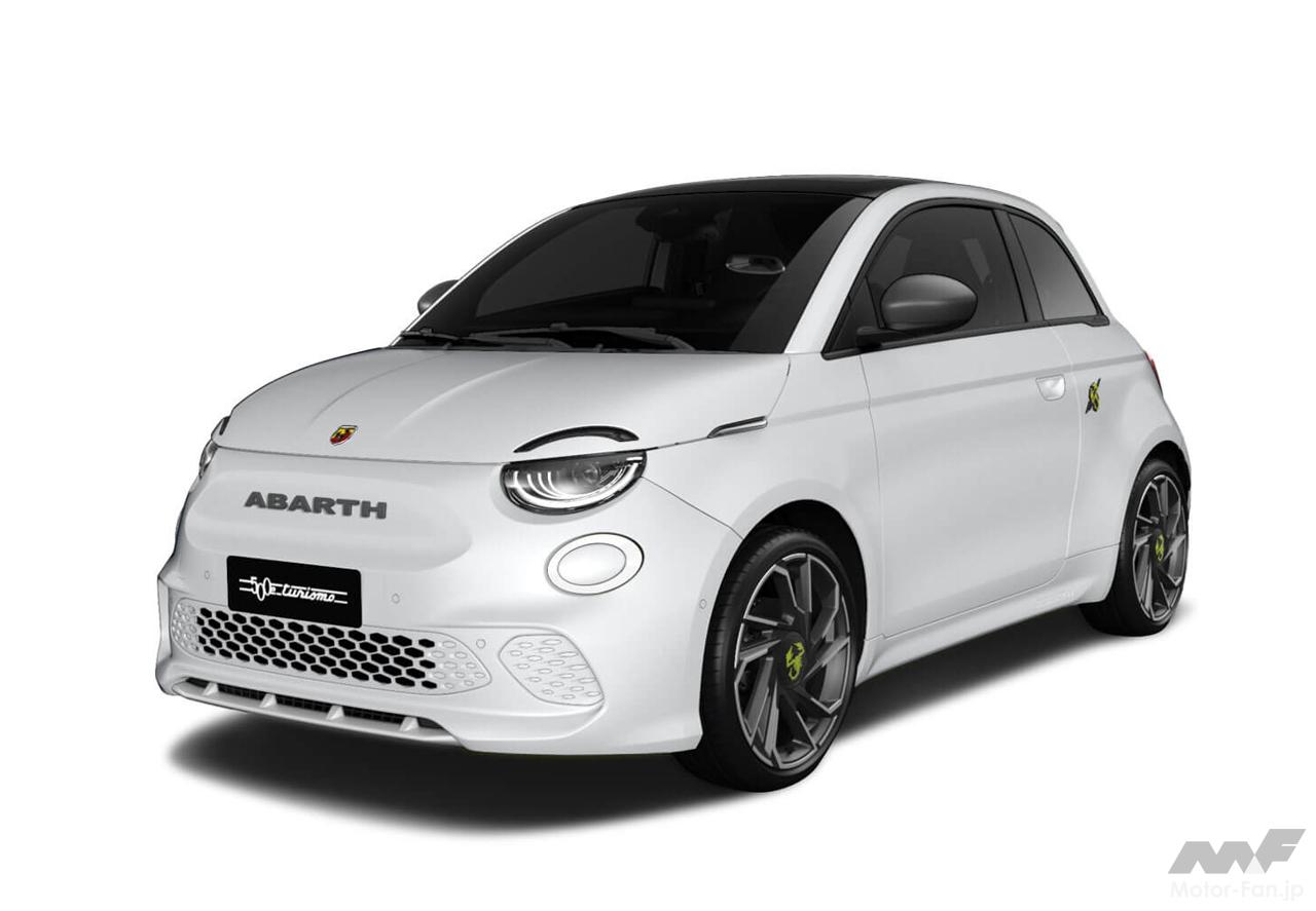 エクステリアは、コンパクトな車体に18インチアルミホイールを採用し、アグレッシブさを持ちながら柔らかなプロポーションを実現。また、スポーティな印象のフロントバンパー、アクセントカラーとしてホワイトを採用したリップスポイラー、精悍な印象を与えるフルLED ヘッドライトなど、コントラストのある引き締まったスタイリングとなっている。リヤフェンダー上部には、電気自動車のアバルトを特徴づける、EV専用のロゴがあしらわれた。