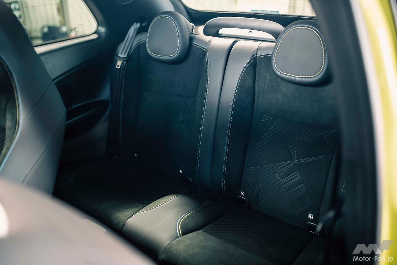 全長3675×全幅1685×全高1520mm、ホイールベース2320mmのコンパクトなサイズを維持しつつ、前輪を駆動する155ps/235Nmのパワフルでレスポンスの優れたモーターと、42kWhのバッテリーにより、低中速域においてもエキサイティングな走りを実現。0-100km/h加速タイムは7秒で、ガソリン車の「アバルト695」とほぼ同じタイムを記録する。20-40km/h、40-60km/h の中間加速ではアバルト695より約1秒速いタイムを記録し、シティ走行においてアバルト695を超えるパフォーマンスを発揮する。なお、WLTCモードにおける一充電走行距離はハッチバックが303km、カブリオレが294kmと発表された。