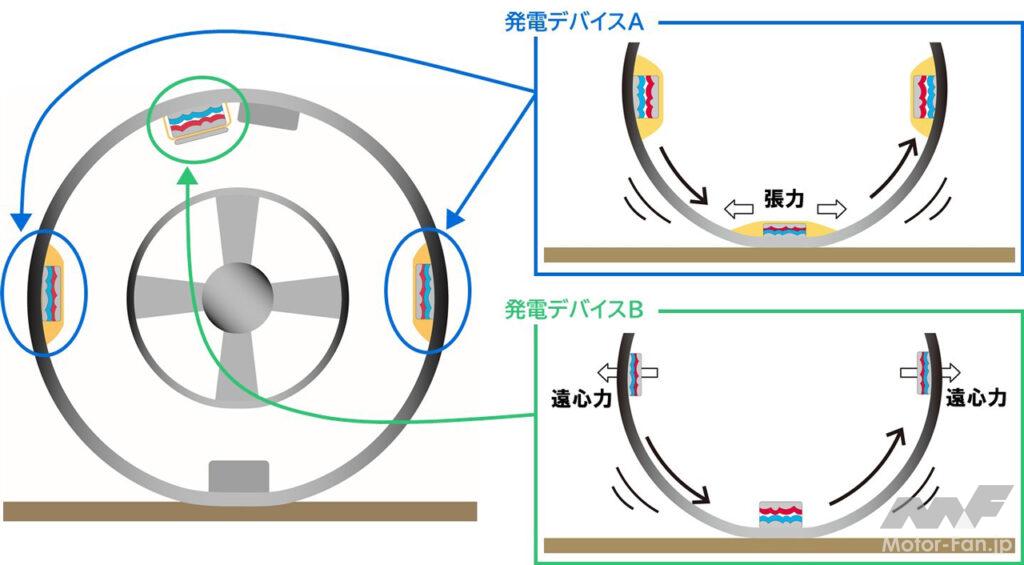 これまでの開発では、タイヤの歪みの変化による張力を利用した低速域での発電(発電デバイスA)に成功している(※)。今回の開発では、加速度変化による遠心力を利用する発電デバイス(発電デバイスB)を適切に配置することにより、高速域でも相当量の電力を得ることに成功した。発電メカニズムの異なる2種類の摩擦発電デバイスを並列接続することで、幅広い速度域で安定した電力を得ることができるようになり、実車を用いた実験でも、低速域から高速域まで安定してTPMSの起動が可能なことを確認した。