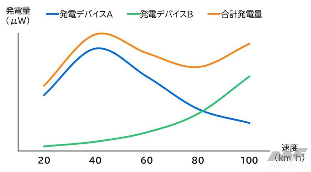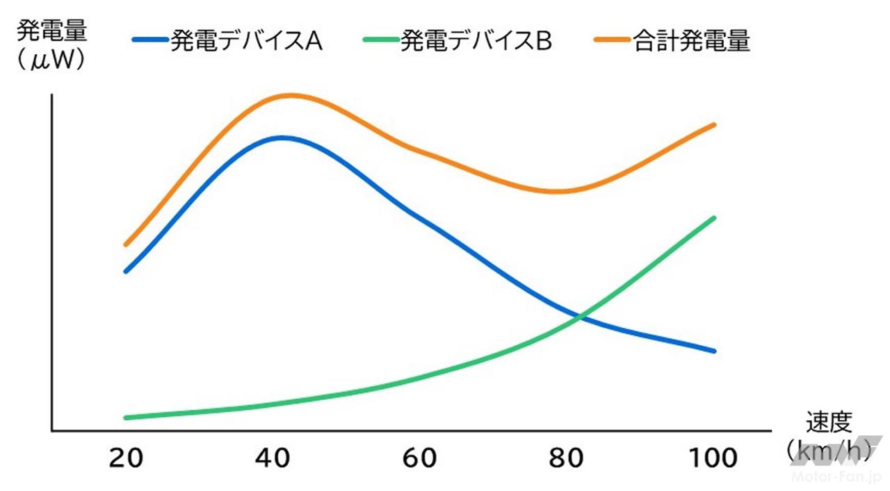 発電メカニズムの異なる2種類の摩擦発電デバイスを並列接続することで、幅広い速度域で安定した電力を得ることができるようになり、実車を用いた実験でも、低速域から高速域まで安定してTPMSの起動が可能なことを確認
