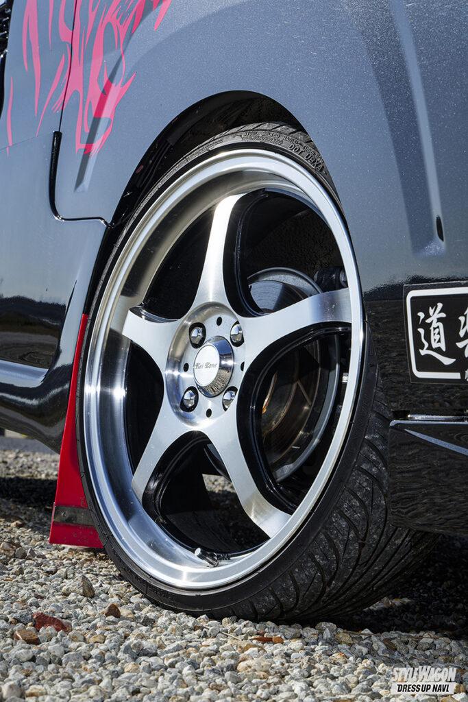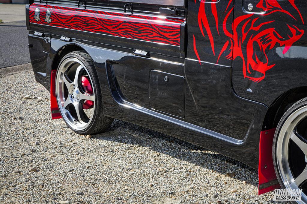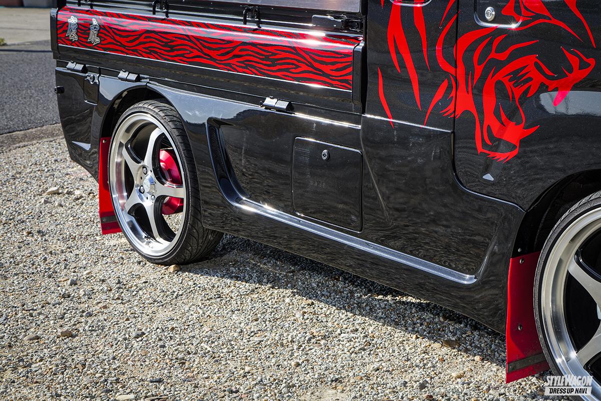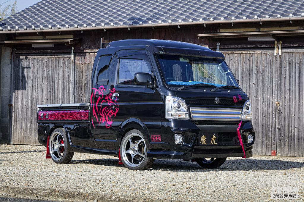 今回ピックアップした軽トラは500後期ハイゼットジャンボと16スーパーキャリイの2台。ハイゼットジャンボはフロントバンパー・バージョン1に、サイドパネル、リアバンパーのエアロ3点キットを装着。足まわりはフロントは全長調整式車高調、リアは15段減衰調整式ショックとリーフスプリングによる「KIT-Rサスペンションキット」でローダウン。荷台はステンレス鏡面タイプのデッキカバーとアングルポストを装着して、仕事仕様でも華やかさは忘れない。その他片側2本出し慶虎マフラーやスリット入りブレーキローター、フロントウインドウ用のひさし「慶虎ひさし」など、細部までこだわりのカスタムが施されていて、働くクルマカスタムのお手本ともいえるデモカーとなっている。