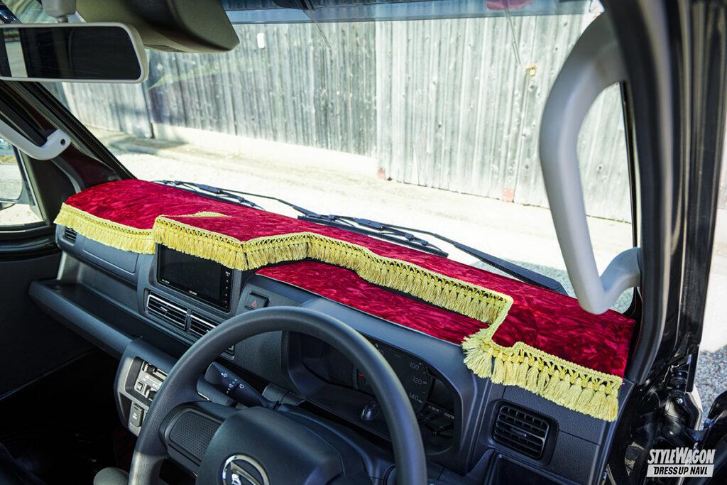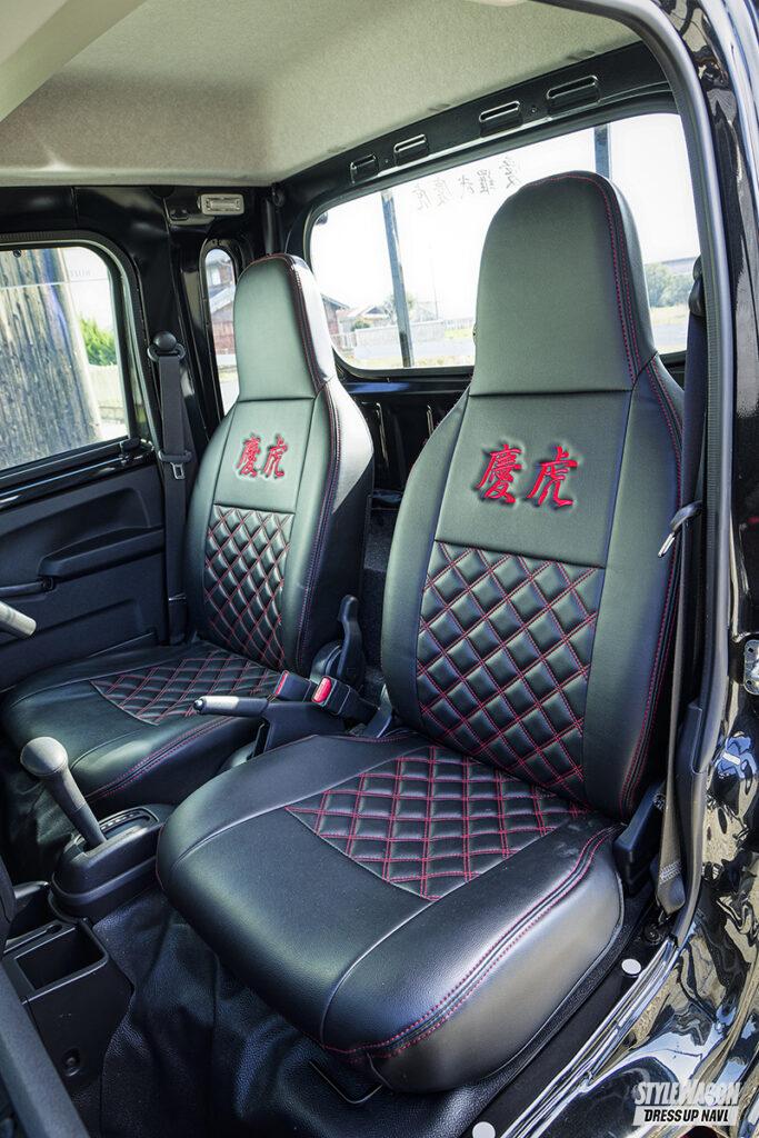 慶虎シリーズでは内装アイテムも豊富にラインアップ。ダッシュマットは大型トラッカーにも人気の生地「金華山(チンチラともいう)」にレースを組み合わせた独特の風合いが特徴。この華やかさは慶虎ならでは。シートカバーはブラックレザーにレッドのステッチと慶虎ロゴの刺繍を入れたもの。その他フロアマットもラインアップされているので、慶虎カラーでインテリアもコーディネイト可能だ。写真の内装はハイゼットジャンボ用だが、キャリイ&スーパーキャリイ用も同様のアイテムがラインアップされている。