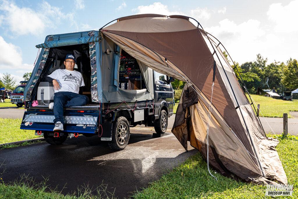 軽トラのカスタム雑誌でバグトラックの存在を知り、そこから大人気の「小野Tube」を視聴するうちに無限の可能性と共感を覚えてしまったというタクトさん。バグトラ乗りとなった現在は遊びやキャンプだけに留まらず、日常的に取り扱い商品を運搬したりと仕事でも大活躍しているとのこと。また、カスタマイズにも意欲的で2インチのリフトアップをはじめ、ハードカーゴのルーフラックやヒッチメンバーなどを装着。就寝スペースとなるテント内部にはポータブル電源で稼働する小型の扇風機を設置するなど快適性の向上にも努めております。