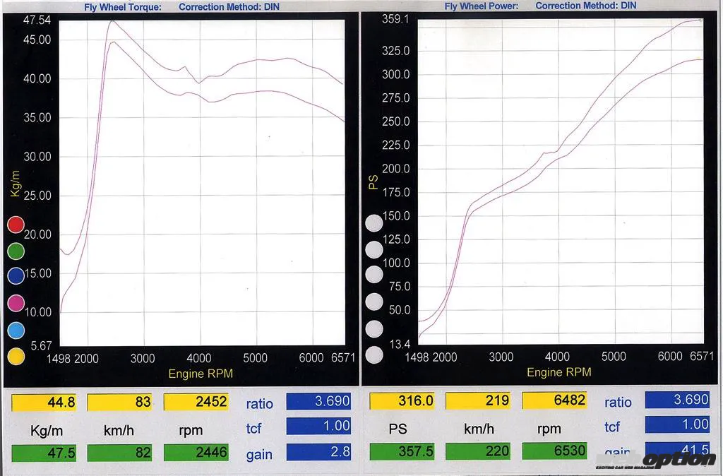 こうして仕上がったM35ステージアは、ダイノパック計測(係数1.0)で357.5ps(キット標準316ps)を発揮。さらに最大トルクも47.5kgmに達するなど、ジェントルなルックスとは裏腹に、過激さを一層増した最強のツーリングワゴンに変貌したのだ。