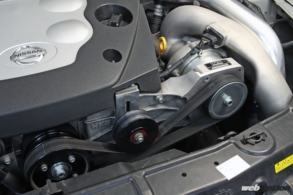 ブーストアップの方法は、スーパーチャージャー本体のインデュースにあるリストリクターの撤去とプーリーの小径化によるもの。