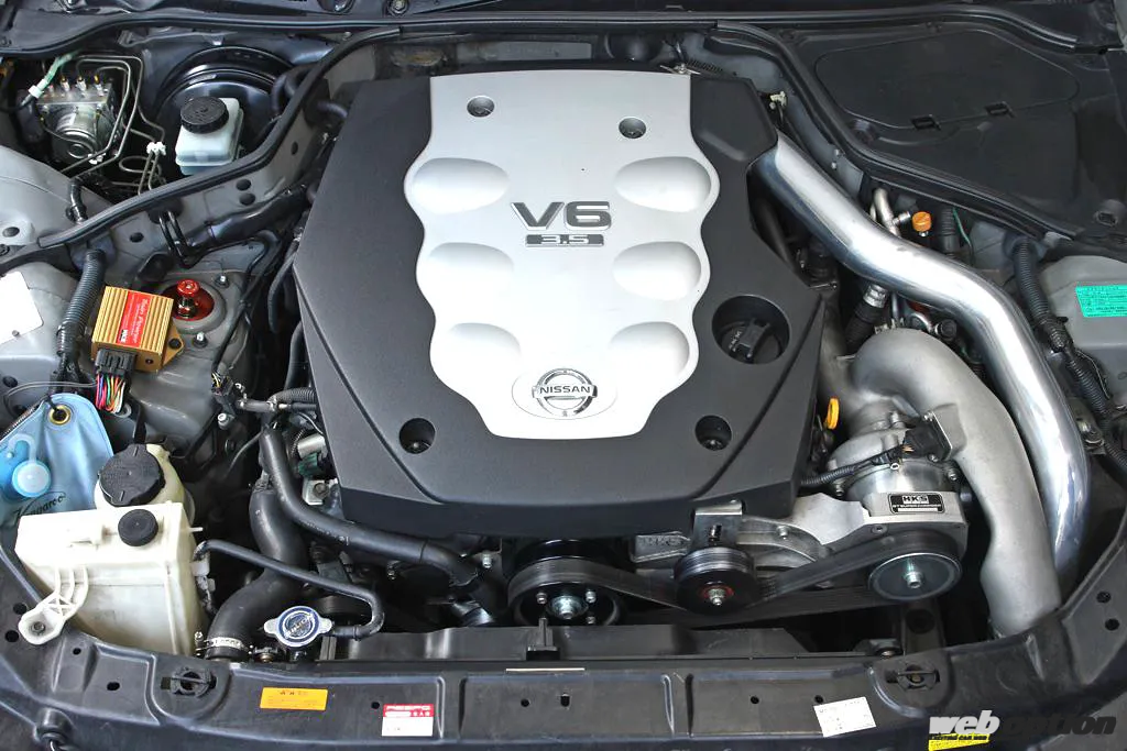 ローコンプ仕様のパワーエンタープライズ製3.8Lキットを組み、さらにHKSのZ33用GTスーパーチャージャーキットを装着。その時点でかなり過激な仕様と言えるが、このM35型ステージアのオーナーはそれで満足できずに“HKSテクニカルファクトリー”を訪れた。