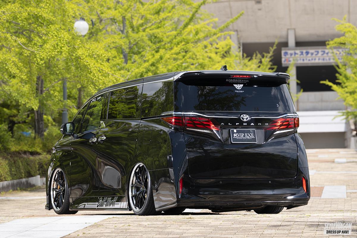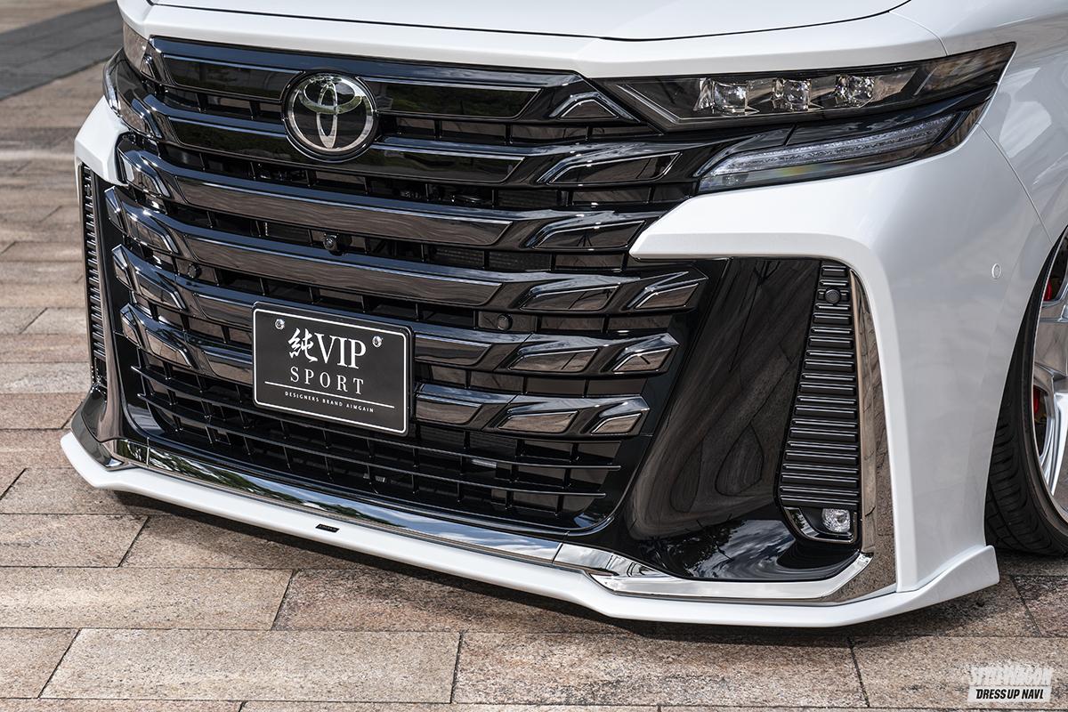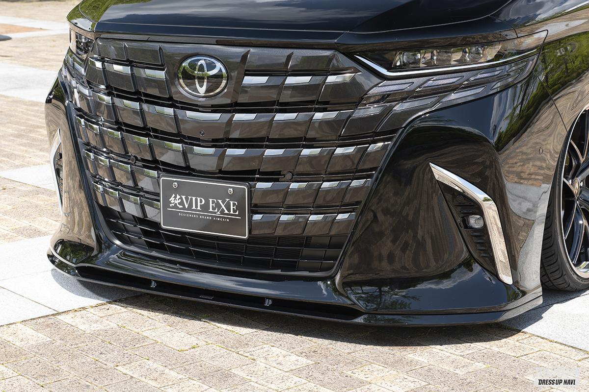 セダンやミニバン、さらに高級外車まで幅広くエアロを手掛けるエイムゲインは、クルマのキャラにあわせシリーズを分けて展開中。アルファードは上質系の「純VIPエグゼ」から、ヴェルファイアは走りを意識した「純VIPスポーツ」からとなり、両者はともに必要最小限のリップタイプだ。前者が落ち着きのあるシンプル系である一方、後者はフロント等の端にカナード風のフィンを盛り込んで走り系に振るなど、似て非なる仕様となる。
