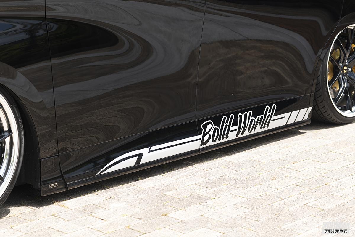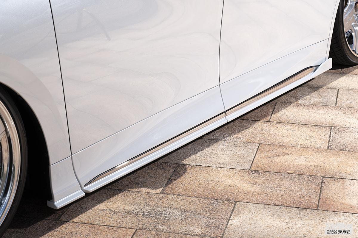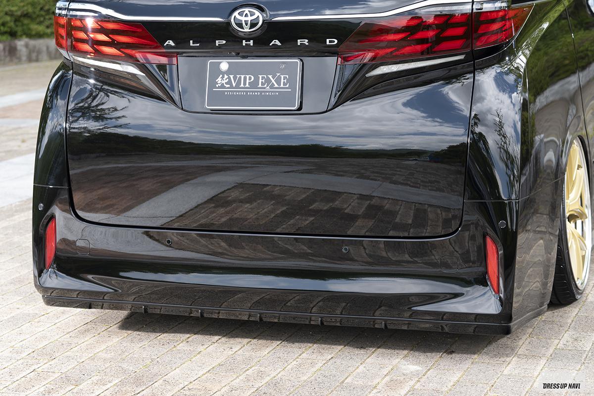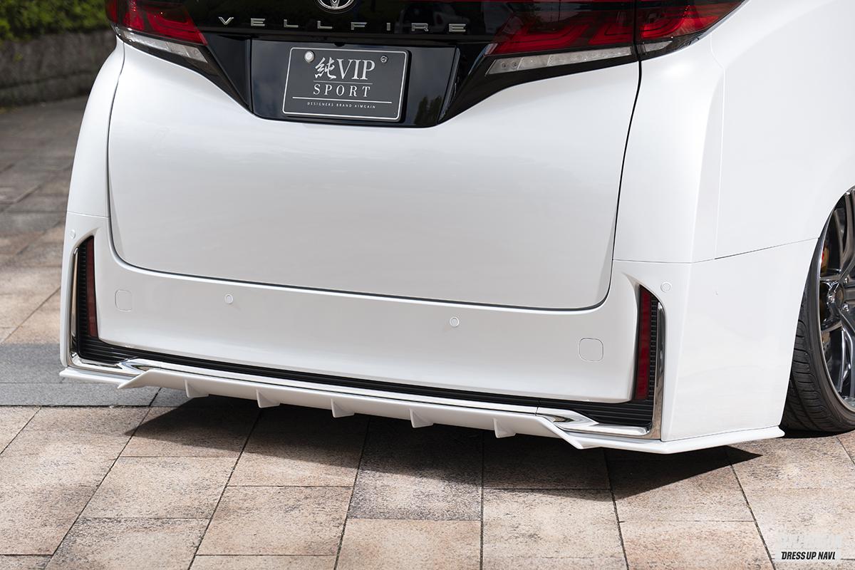 セダンやミニバン、さらに高級外車まで幅広くエアロを手掛けるエイムゲインは、クルマのキャラにあわせシリーズを分けて展開中。アルファードは上質系の「純VIPエグゼ」から、ヴェルファイアは走りを意識した「純VIPスポーツ」からとなり、両者はともに必要最小限のリップタイプだ。前者が落ち着きのあるシンプル系である一方、後者はフロント等の端にカナード風のフィンを盛り込んで走り系に振るなど、似て非なる仕様となる。