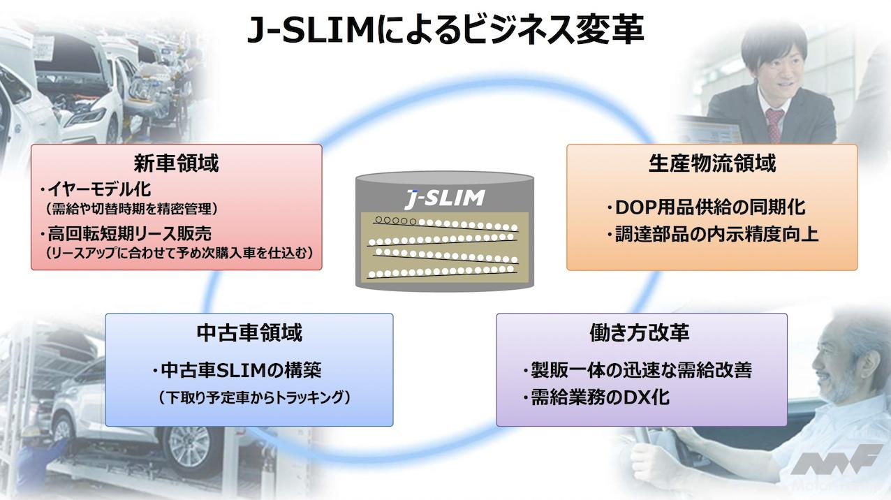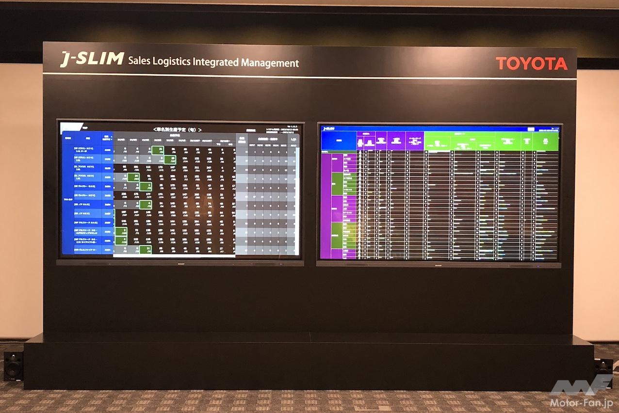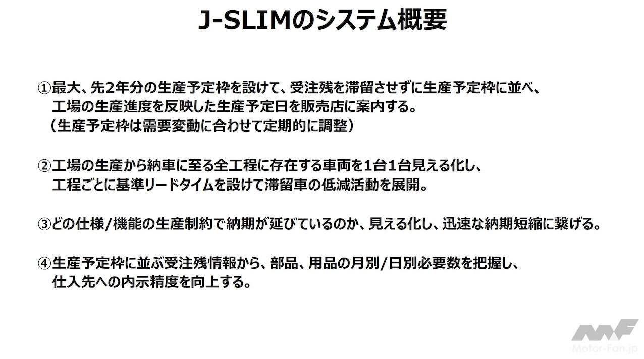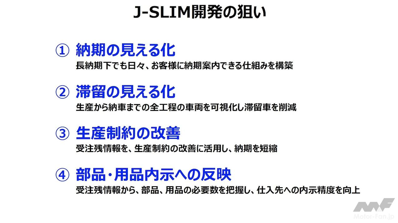 J-SLIMのJは日本(Japan)の意。SLIMはSales Logistics Integrated Managementの頭文字をつなげたものだ。従来は生産(トヨタ自動車)と販売(国内各地の販売店)で一体となっているとは言いがたかった需給システムを根本から見直し、受注から生産計画、生産、配送、納車までを一貫して統合管理することにした。これにより、納期の見える化が実現し、結果として納期の短縮につながっている(例外もある)。