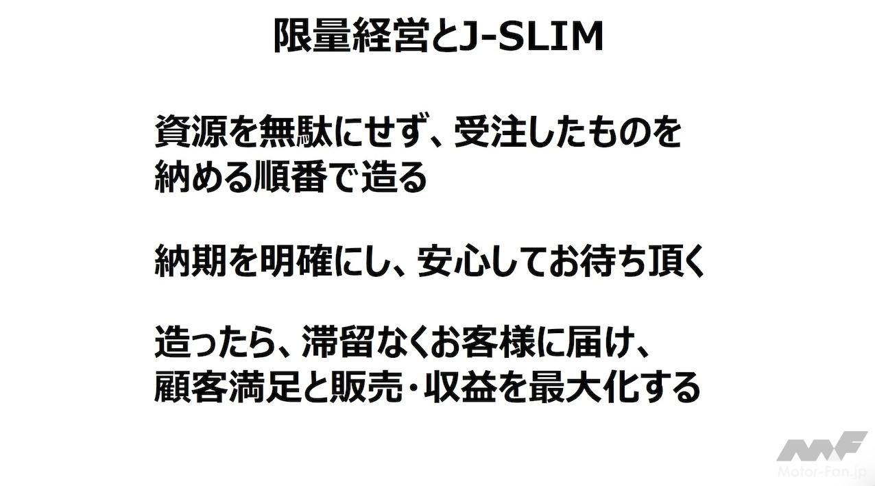J-SLIMの導入にあたり、生産予定枠を最大2年とした。生産予定枠は言い換えれば、生産予定台数のことである。上限を2年に設定したのは、その間、一度も商品改良をしないことなど、現実的にありえないからだ。商品改良が1年後に行なわれる可能性があるのに、現行仕様に対して2年先の注文をとることはできない。だから2年だ。