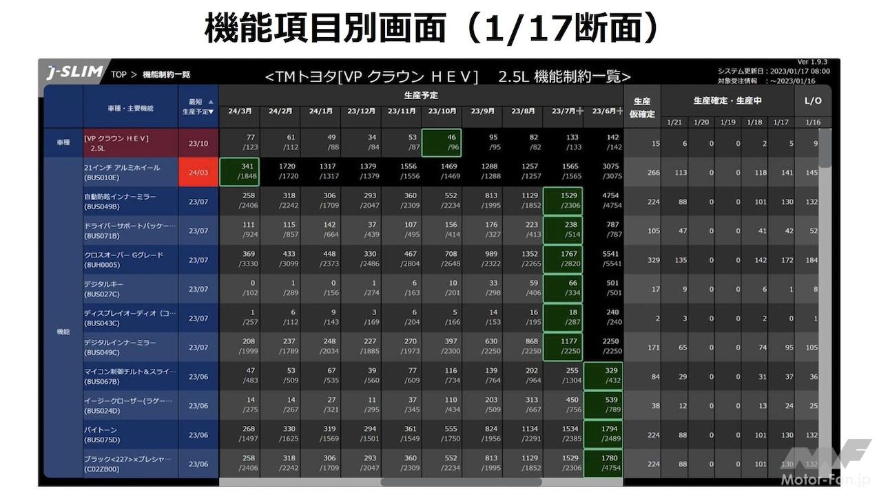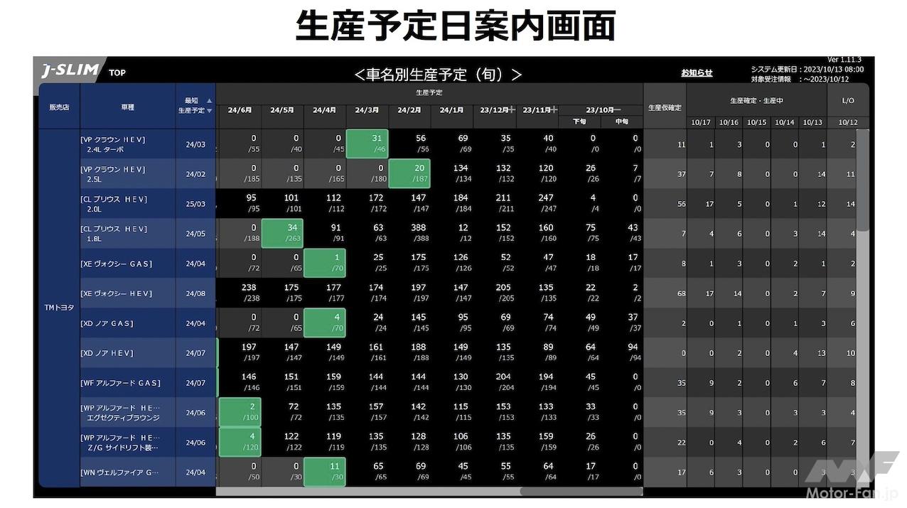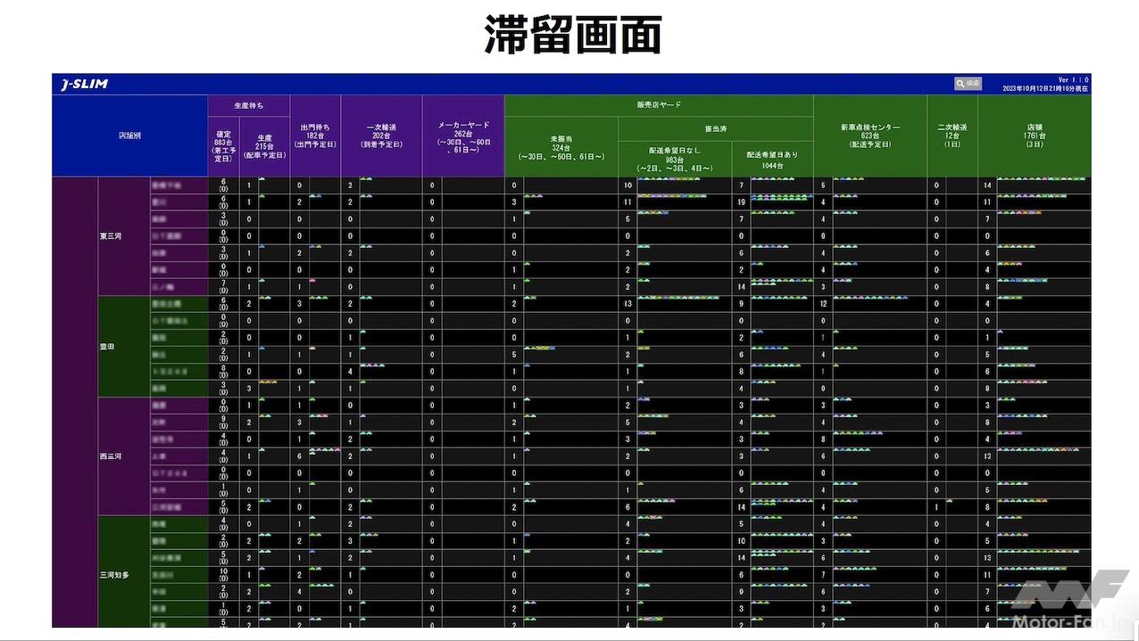 いっぽうで、生産された車両も生産から納車までのリードタイム管理が不十分だったので、タマ不足(注文しても納車までに時間がかかる)の状況だったにもかかわらず、販売店には未登録の車両が滞留していた。こうした状況を解決するのがJ-SLIMで、生産から納車までを生産側からも販売側からも1台1台見える化し、一貫して統合管理する。