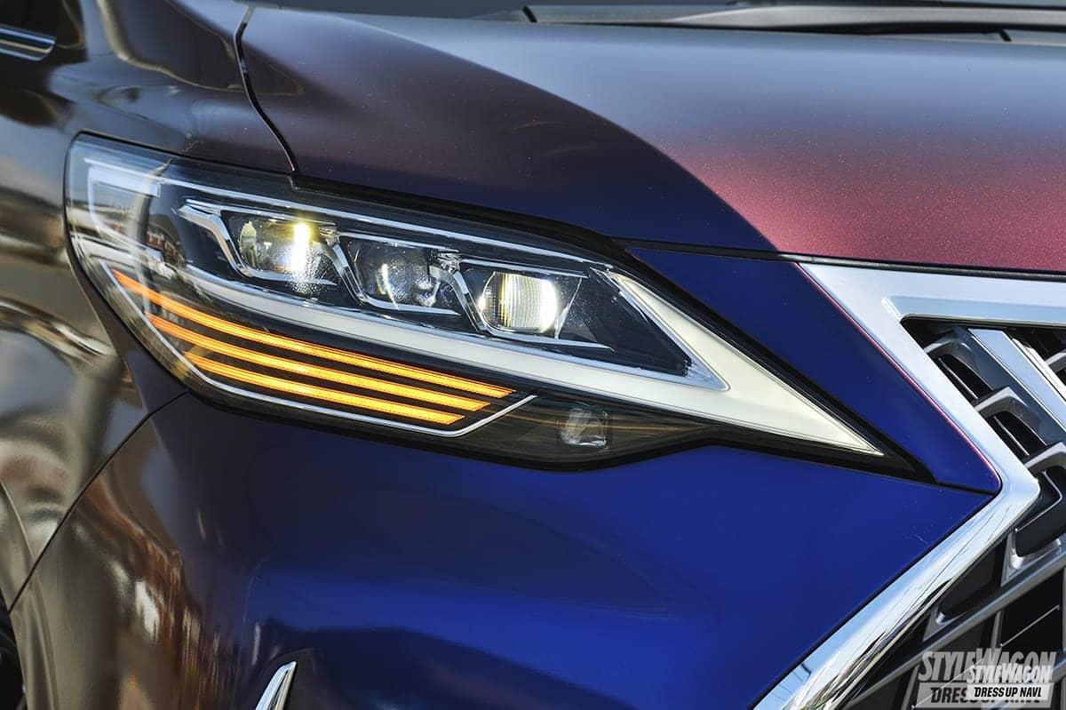 面発光するテールランプや大型のL字デザインを採用するヘッドライトが特徴的なLEXUS LM純正パーツ。マジョーラボディにLEDによる発光がめちゃめちゃ映える。