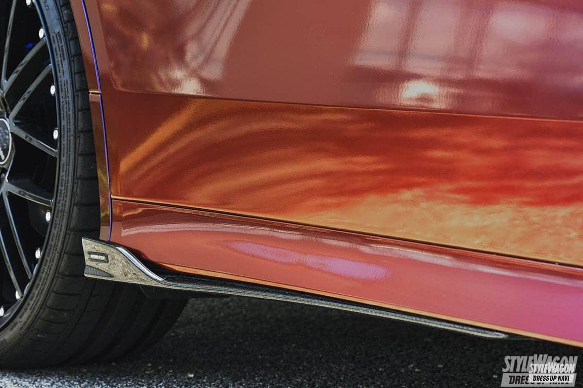 カスタムされた新車コンプリートカーの購入直後、ショップへ預け施工したのがボディラッピング。ボディの傷防止のためにという理由はわかるが、フィルムカラーがなんとマジョーラ。