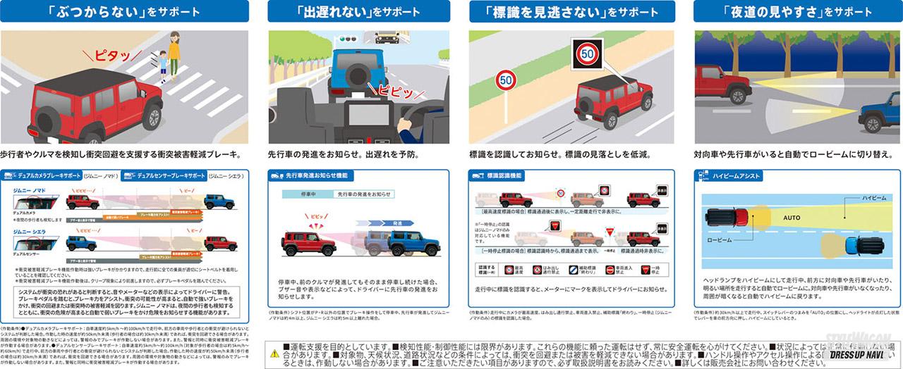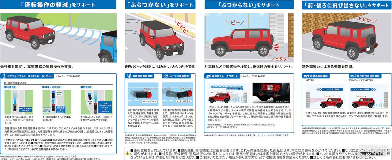 なお、延長されたホイールベースなどにより、最小回転半径シエラの4.9mに対し、5.7mと拡大している。ミニバンでは全長4.26mのトヨタ シエンタが5.0m、全長4.58mのノアが、5.5mとなっている。本格クロカンとしては80年代の70ランクルのショートモデルが全長約4mで5.4m、SUVの初代エスクードノマドが全長3.975mで5.4mとなっている。