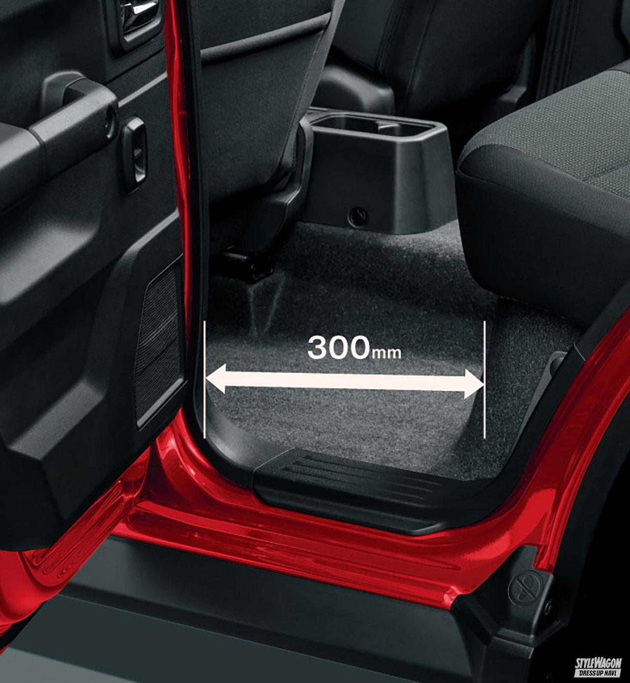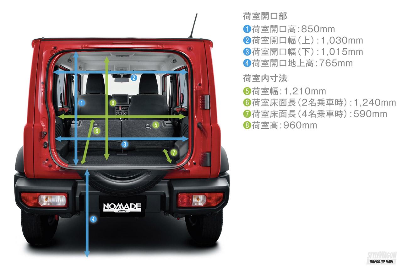 ホイールベースの延長に伴い、4名乗車時の荷室床面長がジムニー シエラに対し350mm拡大している。