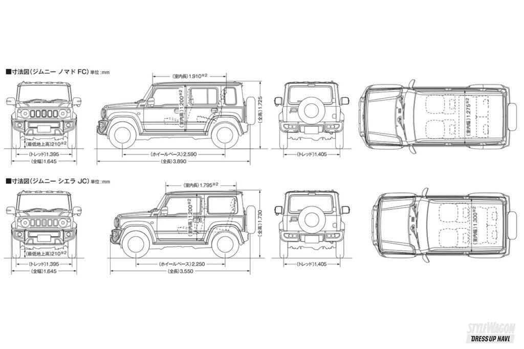 スズキのWEBサイトにある寸法図をピックアップ。一番右の上方からの図面は後端基準となっており、運転席位置などの差が掴みやすい。ノマドの全長は3.89m、シエラのそれは3.55m。