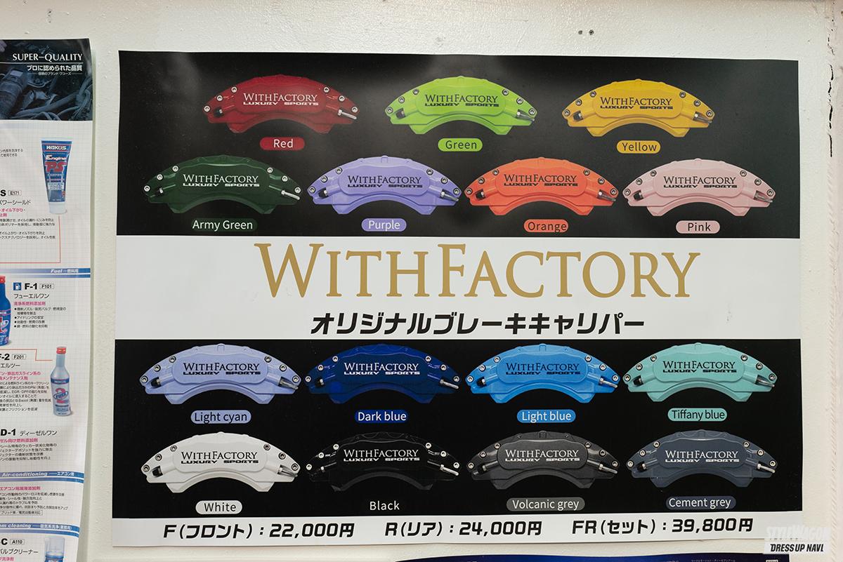 現在、力を入れているのが、ボディラッピングやプロテクションフィルム。愛車のイメチェンやボディ保護に欠かせないメニューだが、ウィズファクトリーではカッティングマシーンも導入し、イメージ通りの施工が可能となっている。釈迦郡(しゃかごおり)代表のポリシーとして「一切手抜きをしない作業」が自慢で、エアロ加工のFRP貼りから削り、塗装と、納得のいくまで一人で作業を行うのがモットー。それだけに時間は掛かるが、完成した車両は、オーナー大満足の仕上がりで、そのワザを求めて全国からお客さんが絶えない大人気ショップとなっている。究極の1台を手に入れたいのなら、まずはウィズファクトリーに相談するのがオススメだ。