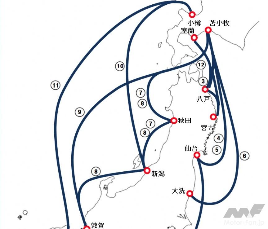 東京圏からの代表的な出発港は、大洗、仙台、新潟、青森の4か所