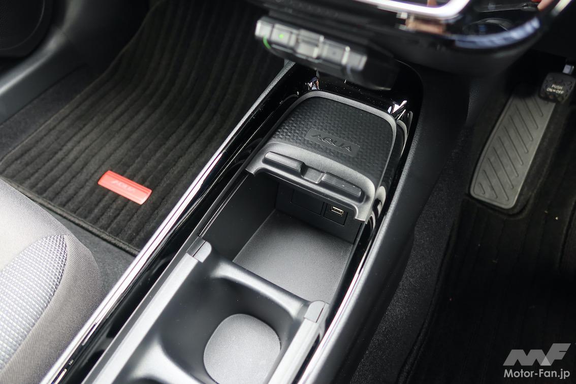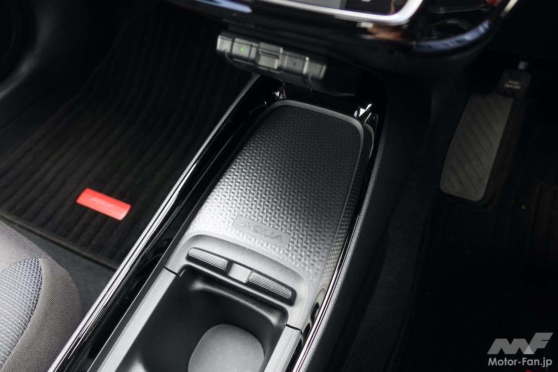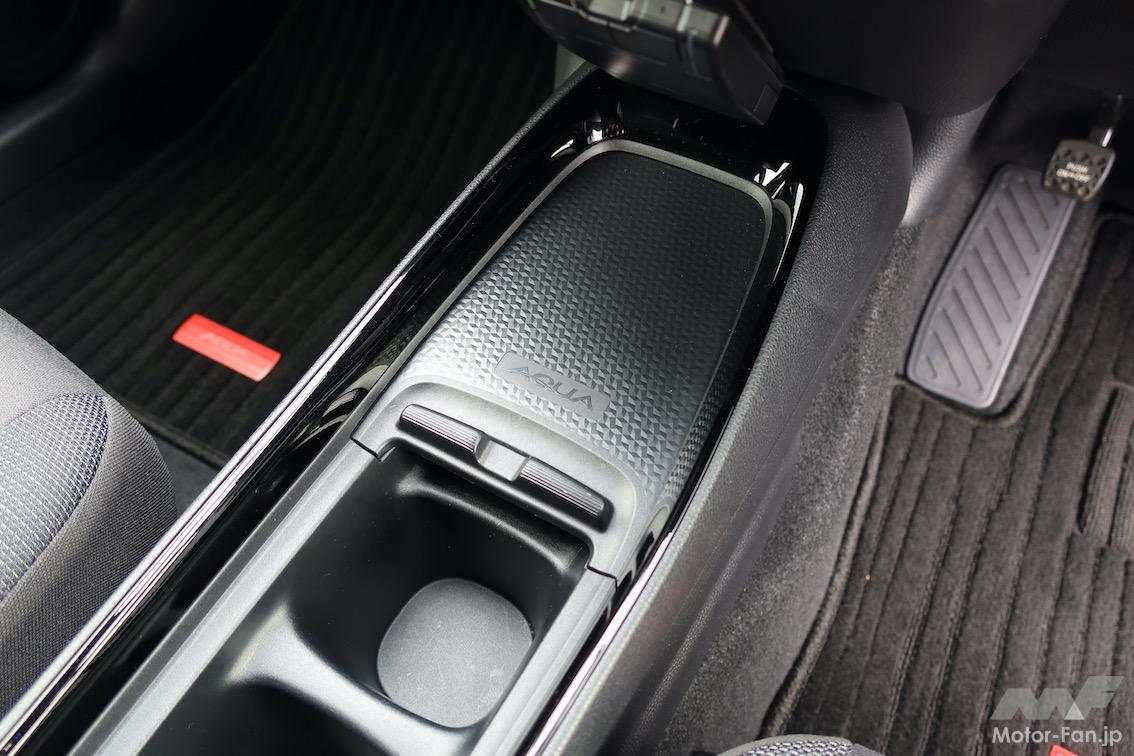 ヤリスは長いシフトセレクターが床から生えるコンベンショナルな形態だが、アクアは小ぶりなシフトセレクターがインパネにレイアウトされている。先進的に見えるし、使い勝手もいい。おかげでセンターコンソールがすっきりとして感じられるし、スマートフォンを置くトレイへのアクセスがしやすい。