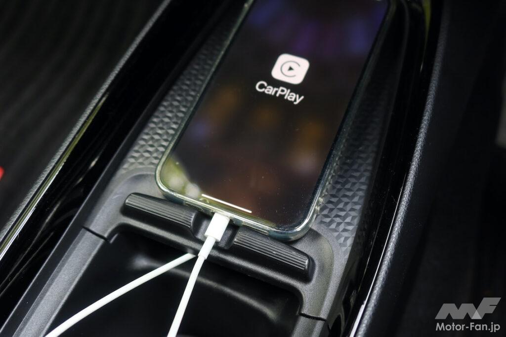 そのスマホトレイだが、トレイを奥にスライドさせると、下部のボックス内にUSBのポートが1口現れる。ここに充電ケーブルを差すとトレイの上にスマホを置くことができないじゃないかと早合点したが、トレイの開け閉めをするツマミの中央部に切り欠きがあり、ちょうどここがスマホに差したケーブルの逃げになってうまく収まる仕組み。よく考えられているなぁ、と感心した次第。