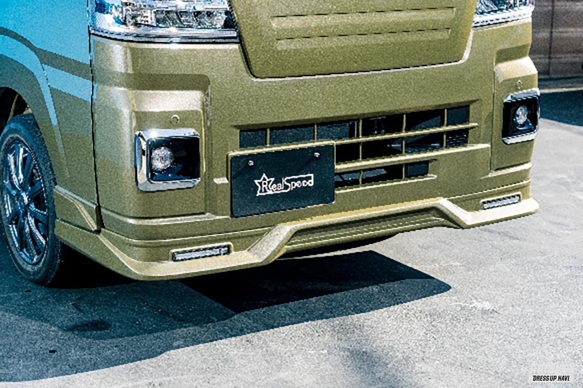 オリジナルブランド「リアルスピード」であらゆる車種のエアロを開発し、そのエアロをまとったコンプリートカーも積極的に販売しているオートリアル。500ハイゼットはまずマイナー前から手がけており、多くのユーザーが愛用しているが、ついに現行モデルのマイナー後期用がラインアップした。フロントまわりの意匠が大幅に変わったこともあり、フロントリップの造形はマイナー前を踏襲せず、新規でデザインした。全体にエッジを効かせて、中央を立ち上げたデザインはアグレッシブで、スポーティ感に満ちあふれている。塗り分けでイメージを変化させるのも面白いだろう。注目したいのがドア前方の下側にパネル状のパーツを採用したこと。側面に厚みを持たせることで、より立体的なデザインの表現が可能となったのだ。